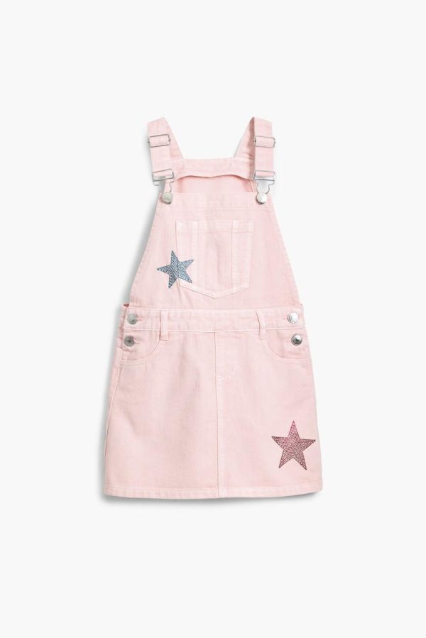 Adorable denim pinafore dress featuring playful star accents and convenient side pockets for your little one’s treasures