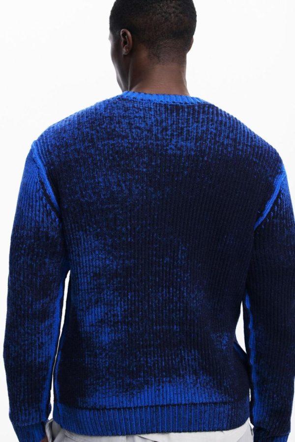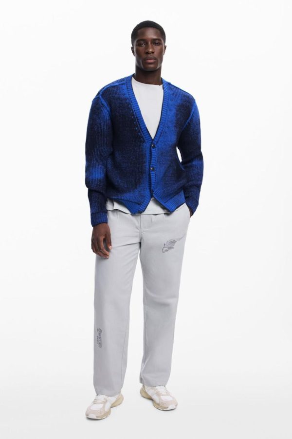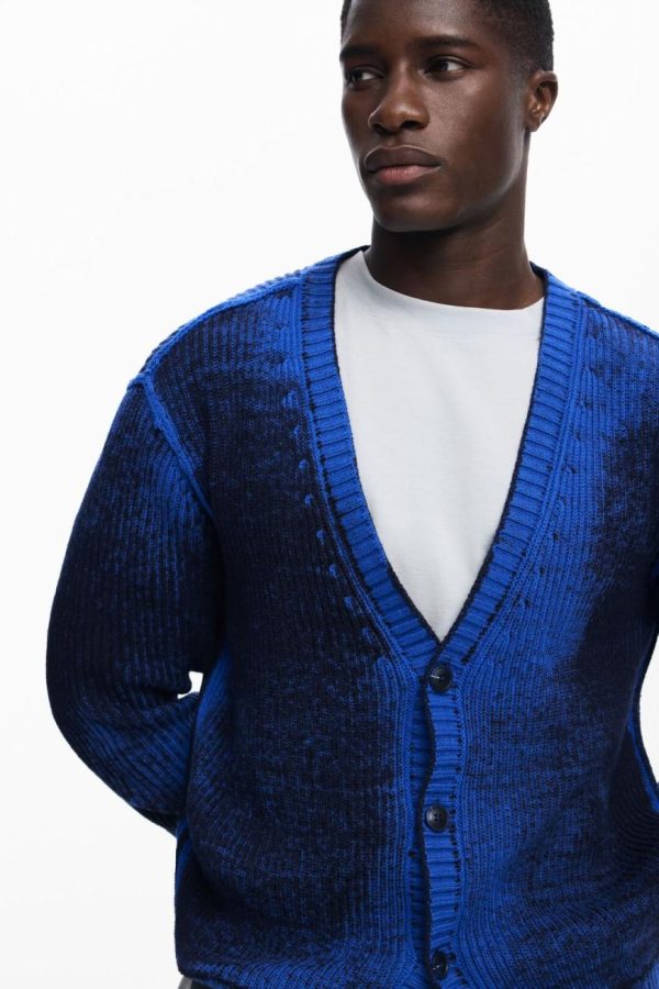 Cardigan-style sweater made of thick knit with ribbed fabric details on cuffs and sleeves and a gradient color print.