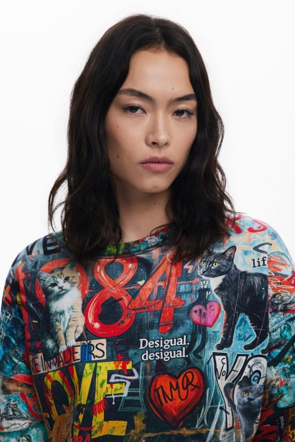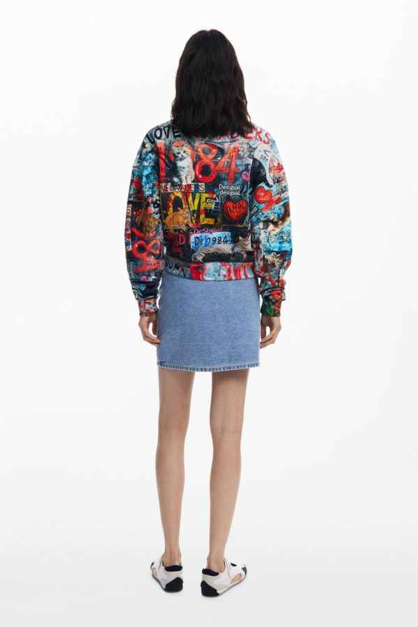 Cropped sweatshirt with long sleeves, round neck, and worn-effect graffiti-style print.