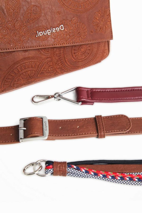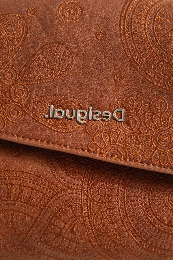 Original leather effect handbag that you can also carry crossed. With flap with magnetic fastener and zipper, with embossing of friezes all over its surface. Outer hanging embellishment.