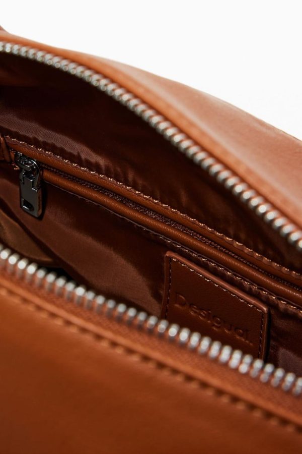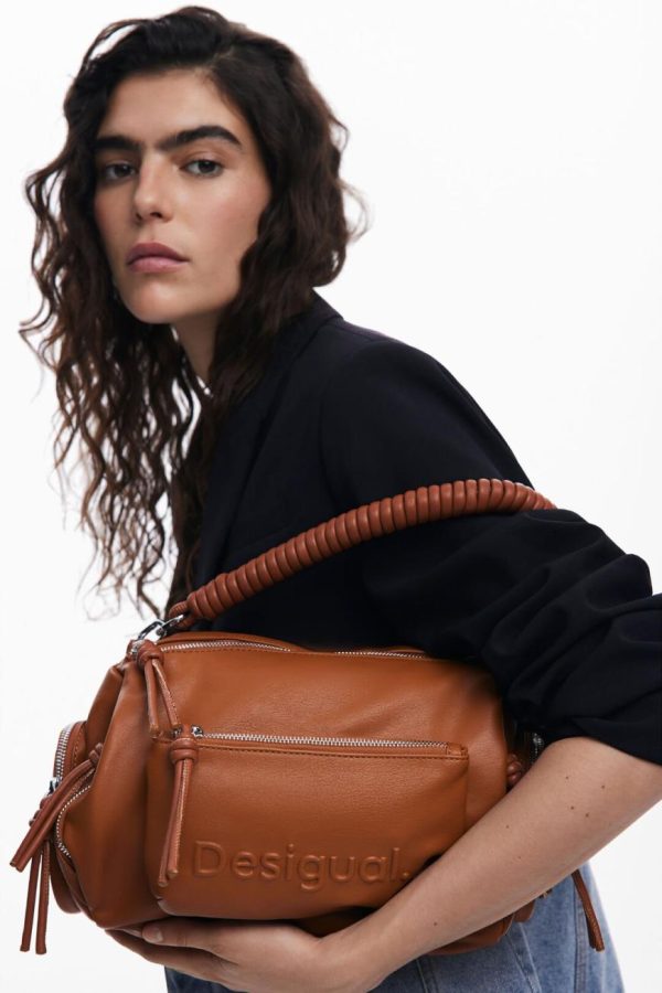 Multi-pocket handbag with interchangeable handles and front logo