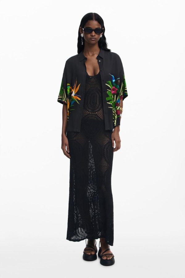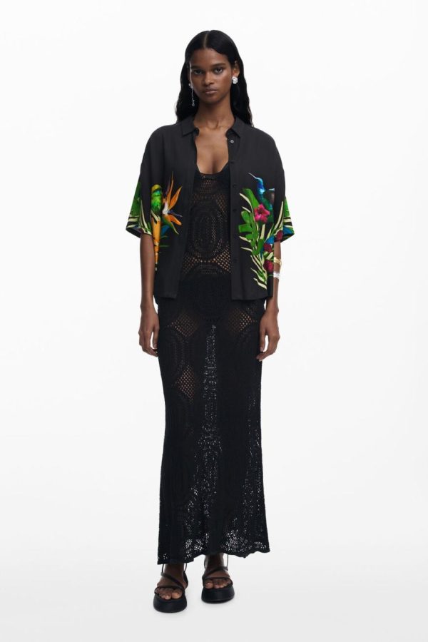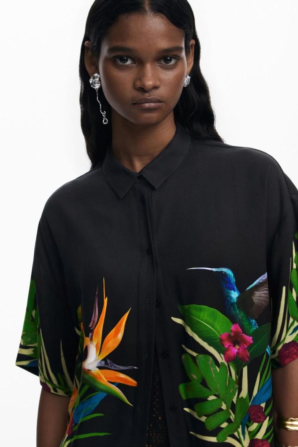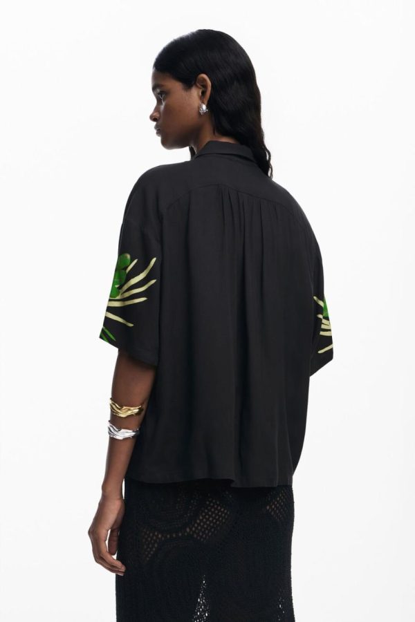 Short-sleeve shirt with a plain background and Hawaiian-style floral details, button closure, and shirt collar.