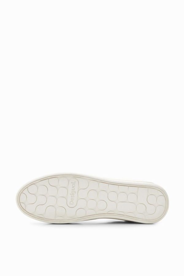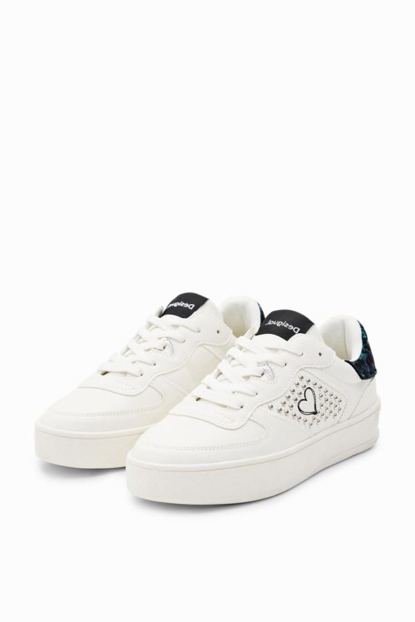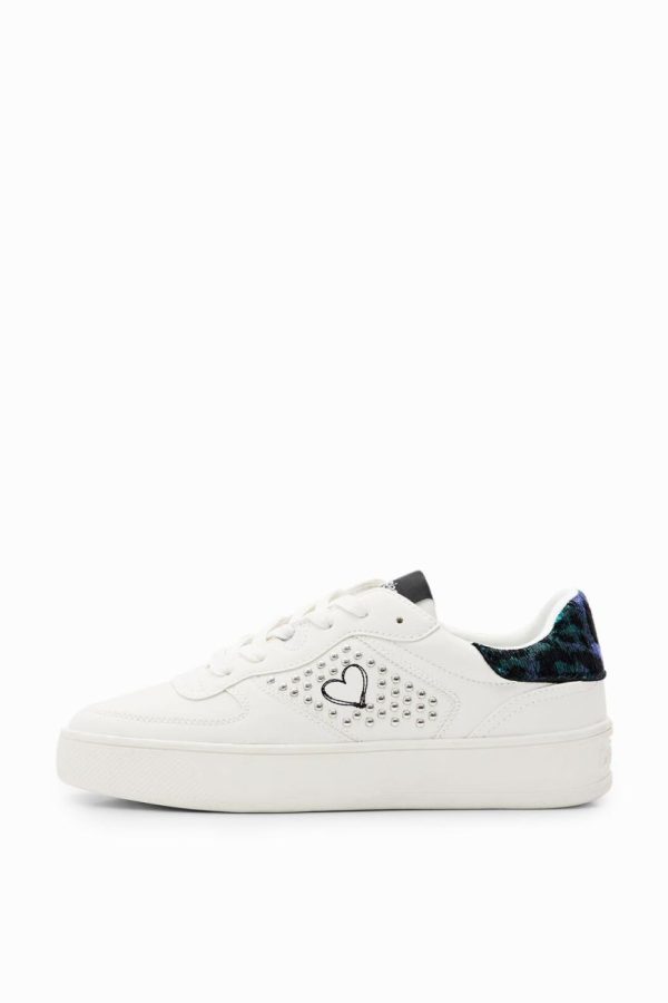 Low-top sneakers with a platform sole, studs and heart embroidery on the outside and jacquard on the back.