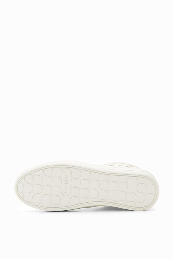 High-top platform sneakers in patent-effect fabric with die-cut circles of different sizes. Featuring velcro straps at the bottom of the tongues.