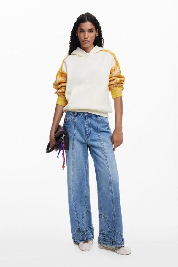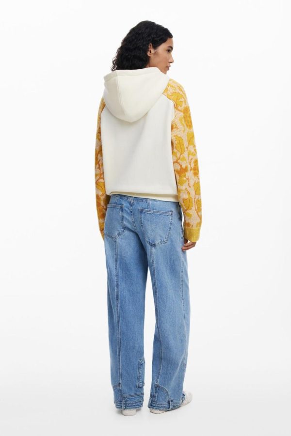 Elevate your casual wardrobe with this stylish sweatshirt featuring a solid color body and beautifully detailed jacquard sleeves with ornamental print. Designed for everyday comfort, it includes a convenient front kangaroo pocket and adjustable hood for versatile wear.