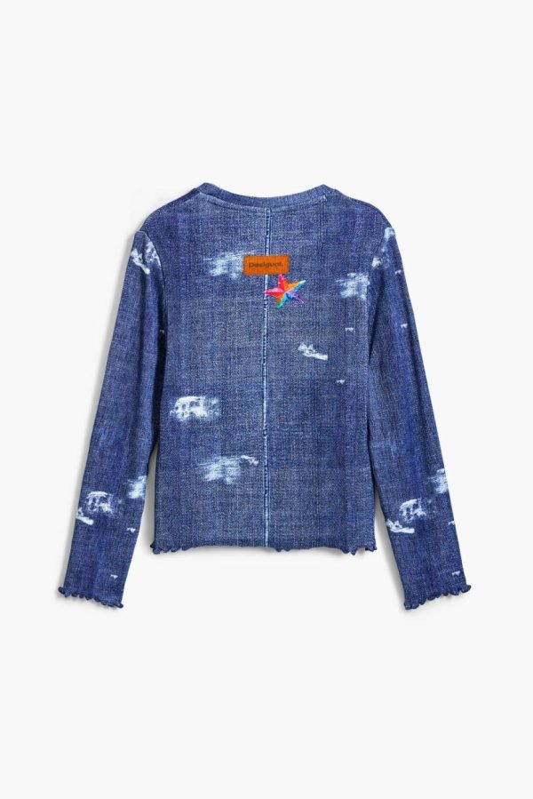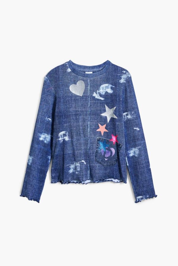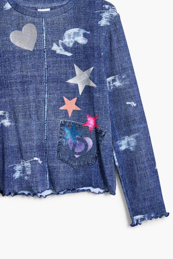 Stylish long-sleeve denim-look T-shirt featuring a practical front pocket and vibrant multicolored hearts and stars print that kids will love