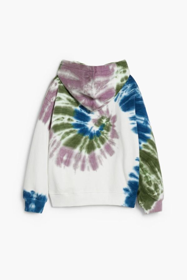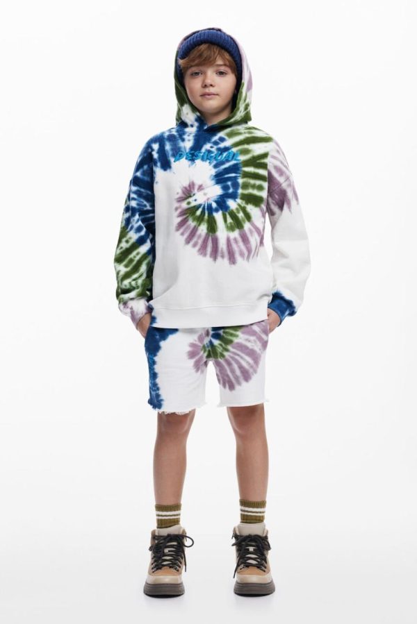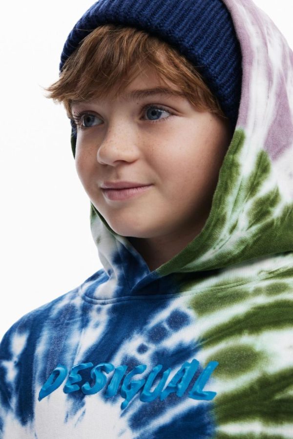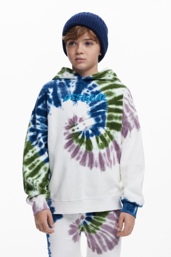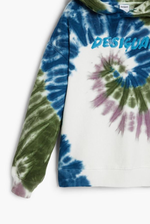 Stylish long-sleeve hooded sweatshirt featuring comfortable elastic cuffs and waistband, vibrant tie-dye pattern, and a bold embroidered logo on the chest for that signature Desigual flair.