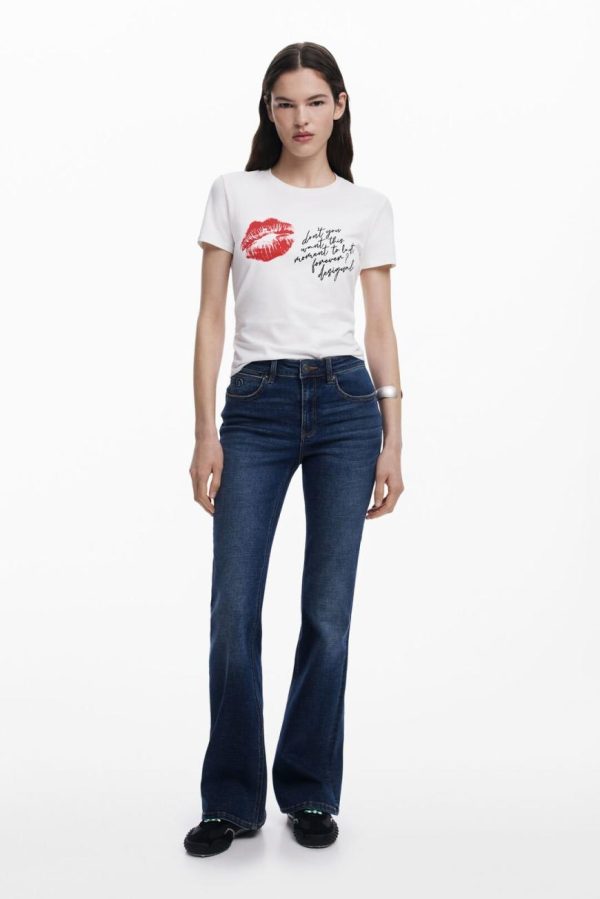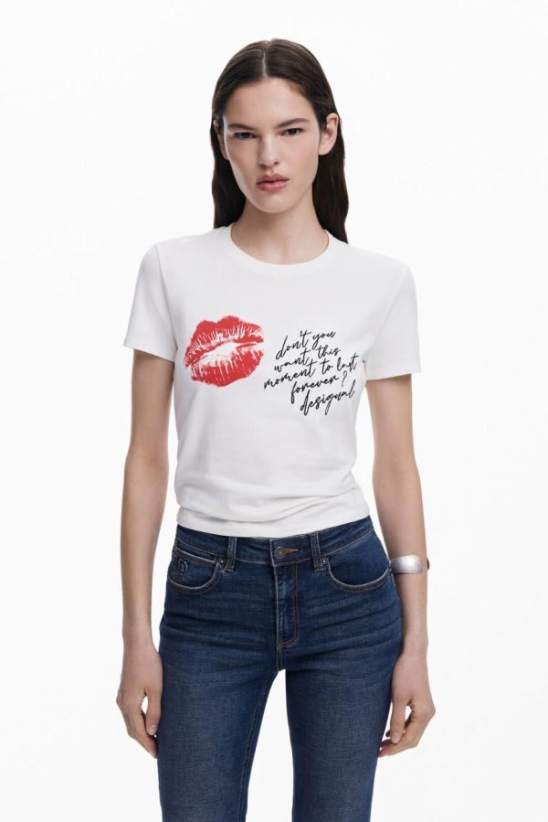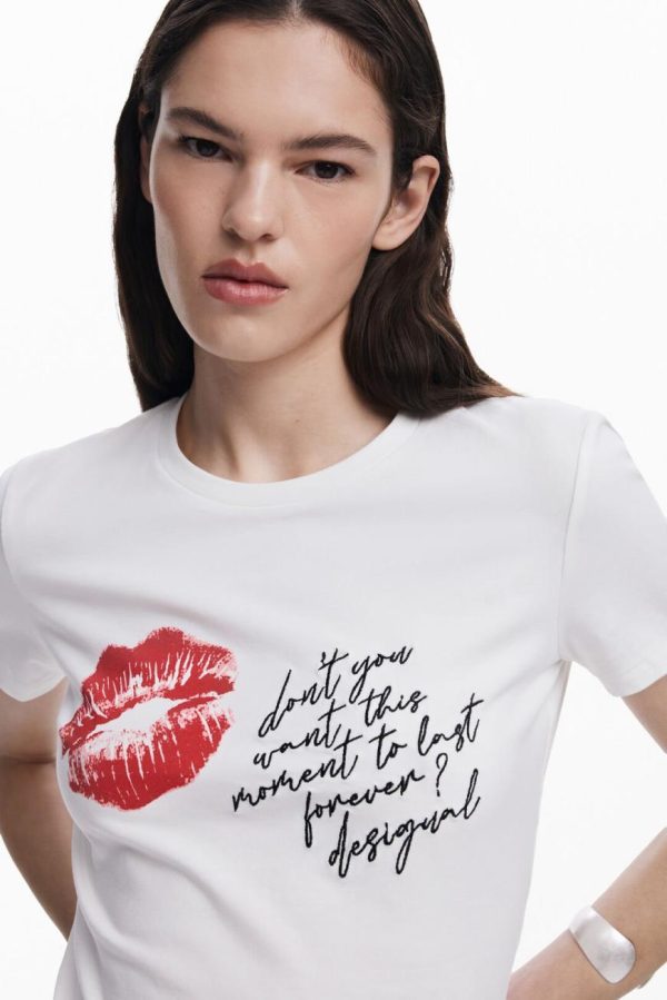 Solid color short-sleeve cotton T-shirt with a round neck, featuring a message and kiss print.