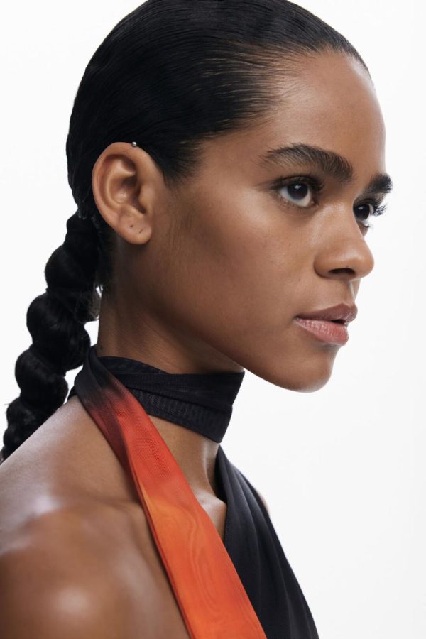 Sleeveless tulle top with front draping, asymmetric neckline with knot, and blurred large flower print.