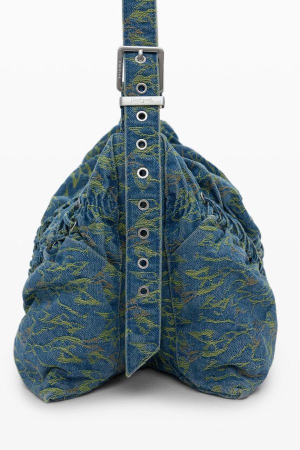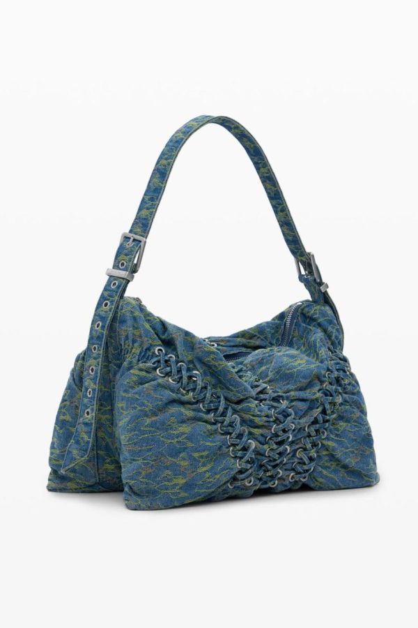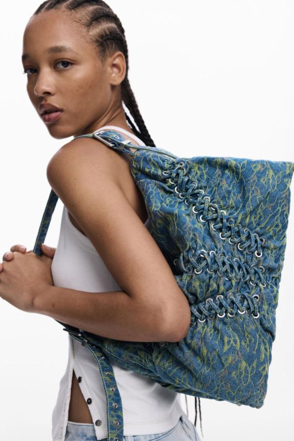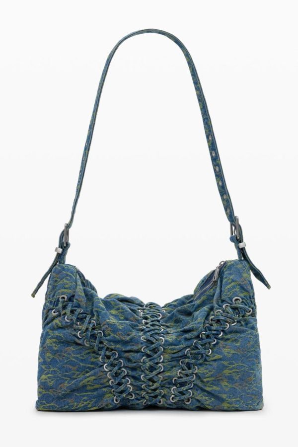 Crossbody bag in denim fabric with zipper closure, adjustable strap, interior zippered pocket, and braided cord details.