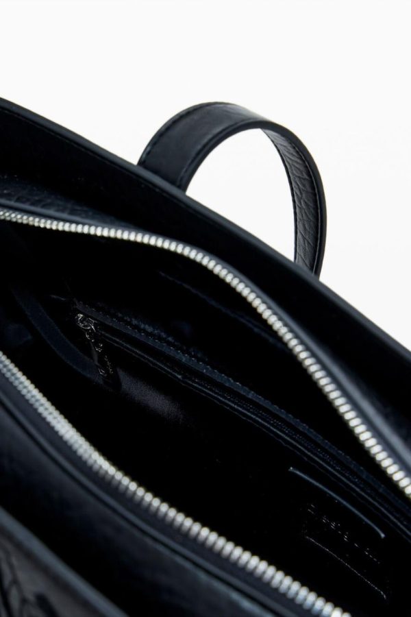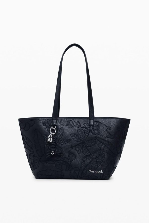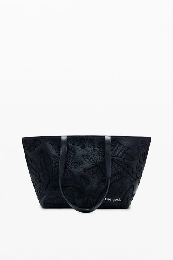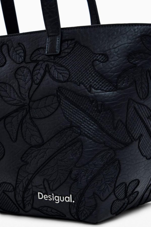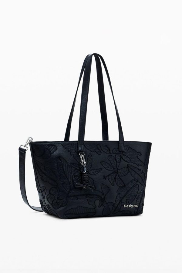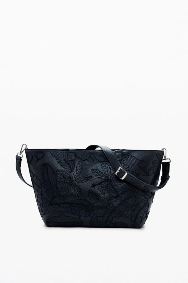 Shopper bag in faux leather fabric, with fixed handles, detachable long strap, and floral motif embroidery.