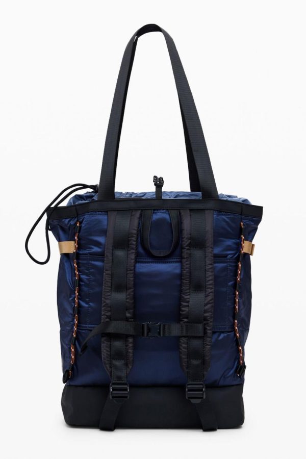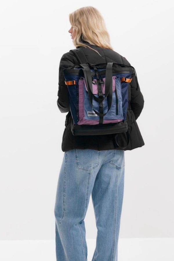 Large modular nylon backpack with handles convertible to tote bag, expandable, with bottom compartment and multiple pockets.
