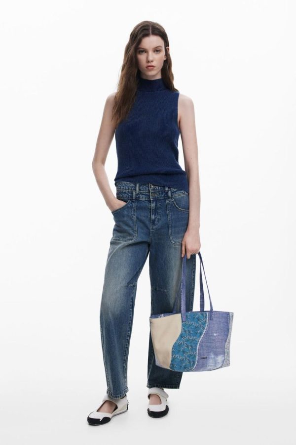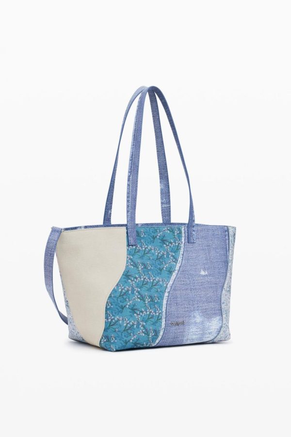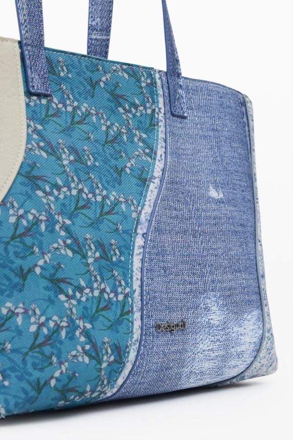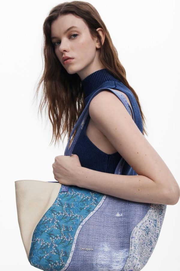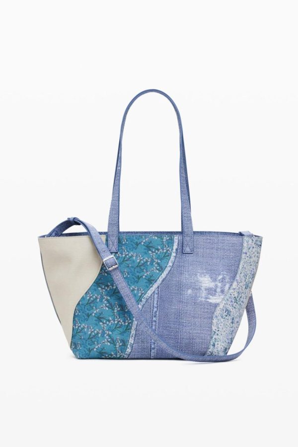 Small crossbody style bag in faux leather with denim-like print, interchangeable handles, and various interior compartments.