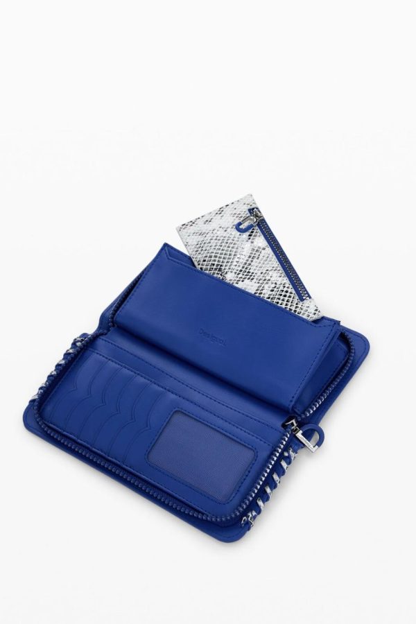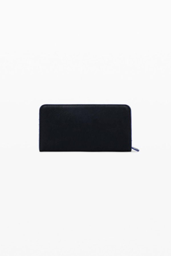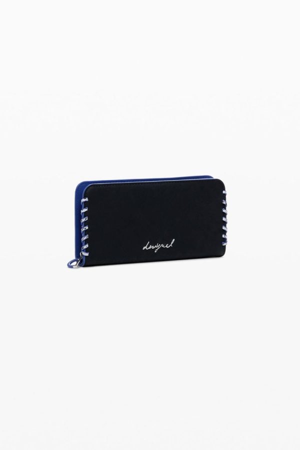 Large faux leather wallet with side stitching, zippers, card slots, and engraved metallic logo.