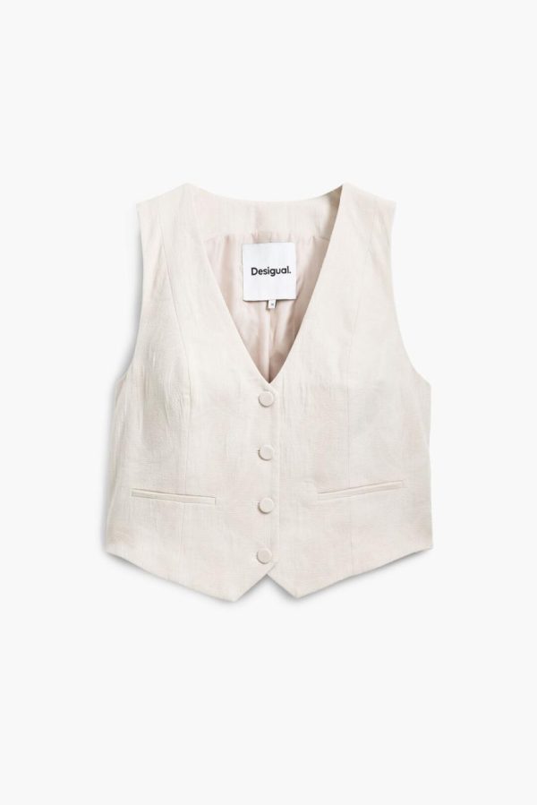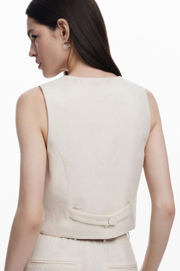 Tailor-style vest with V-neck, button closure, and solid color with leaf print.