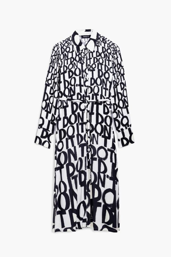Midi shirt dress, soft touch, long sleeves, shirt collar, front buttoning, and detachable belt detail with black and white letter print.