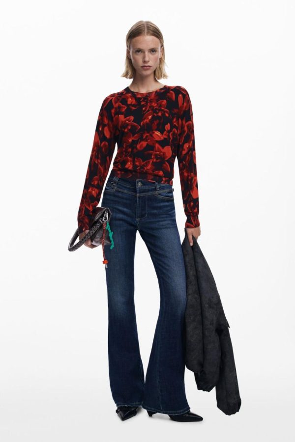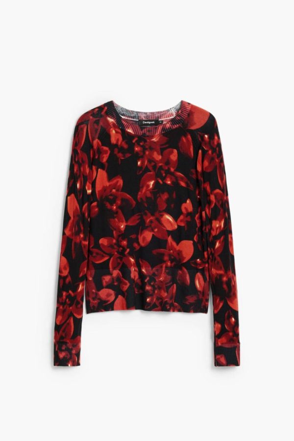 Lightweight regular-fit sweater with long sleeves and a round neck, featuring a floral print in orange tones.