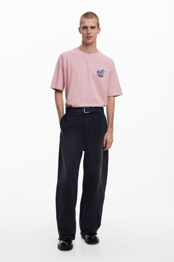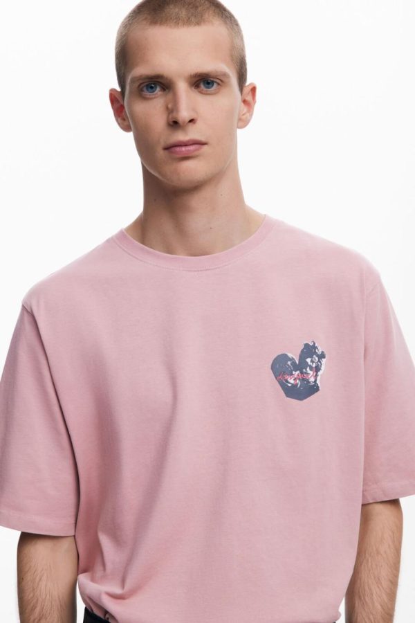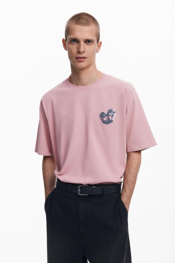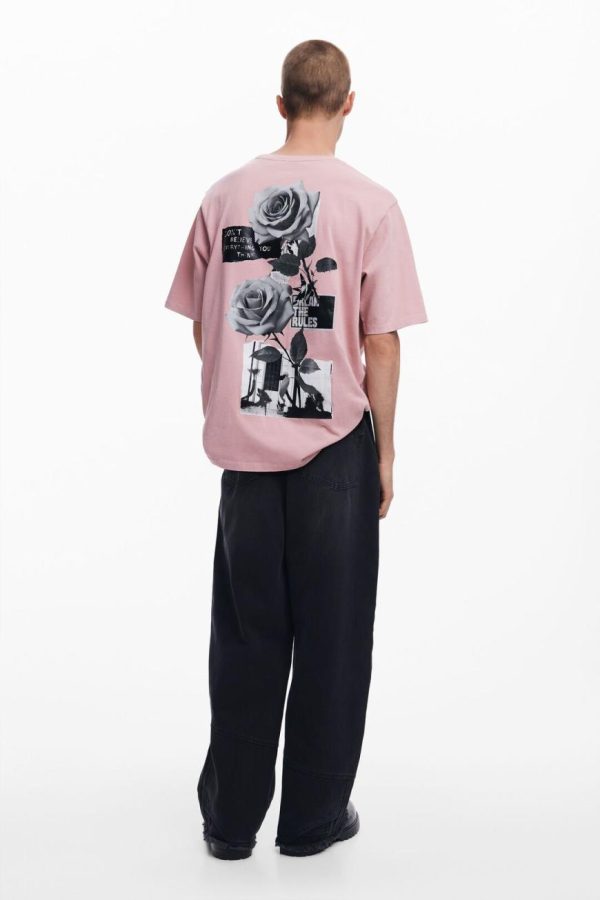 Short-sleeved T-shirt with a round neck featuring a collage effect print of magazine cutouts and lithographs, and an embroidered logo detail on the front.