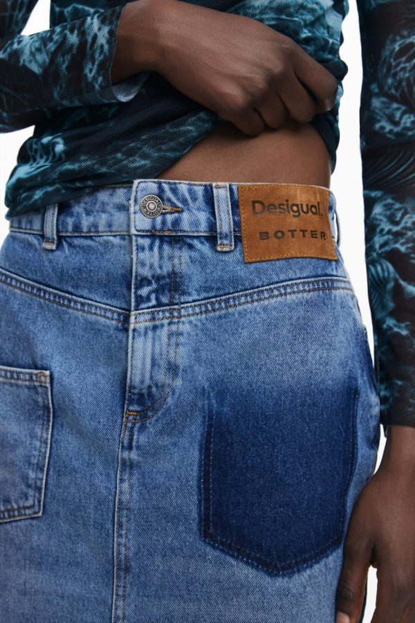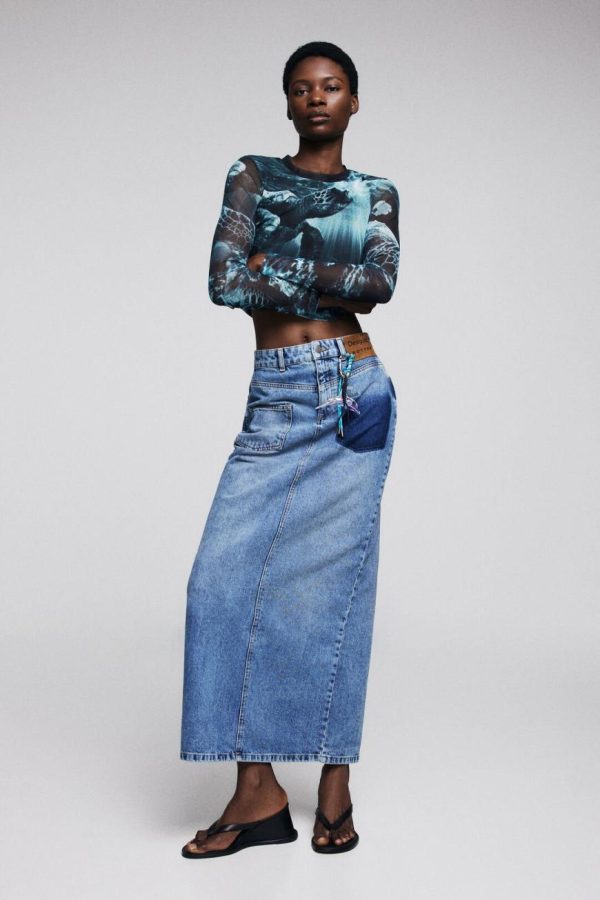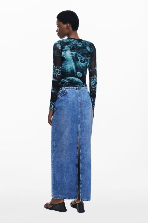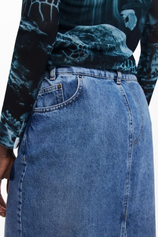 Long denim skirt with inverted design where the front and back are swapped, with slits and leather label with logo on the waist.