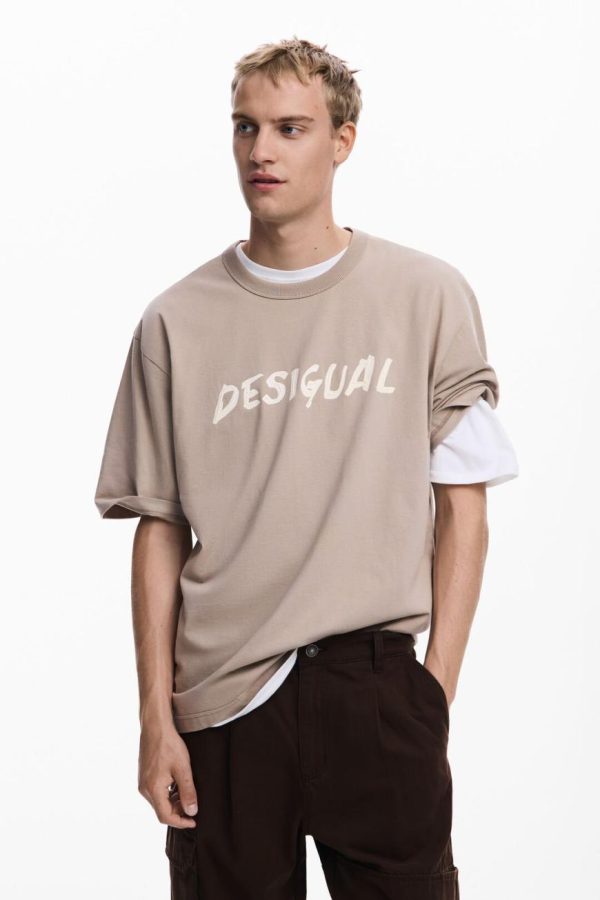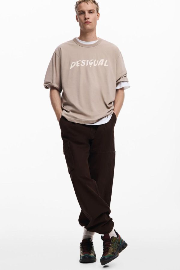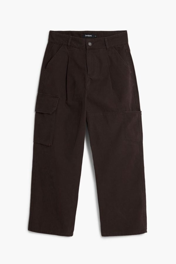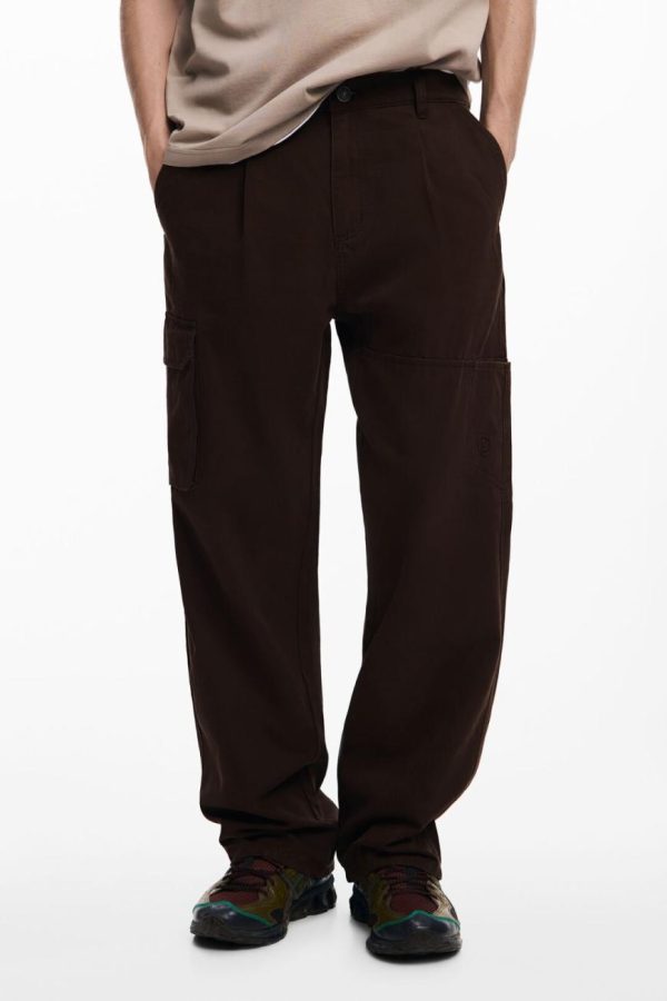 Long cargo-style pants with a large side pocket, worn effect, and contrasting color patch on the lower part of the leg.