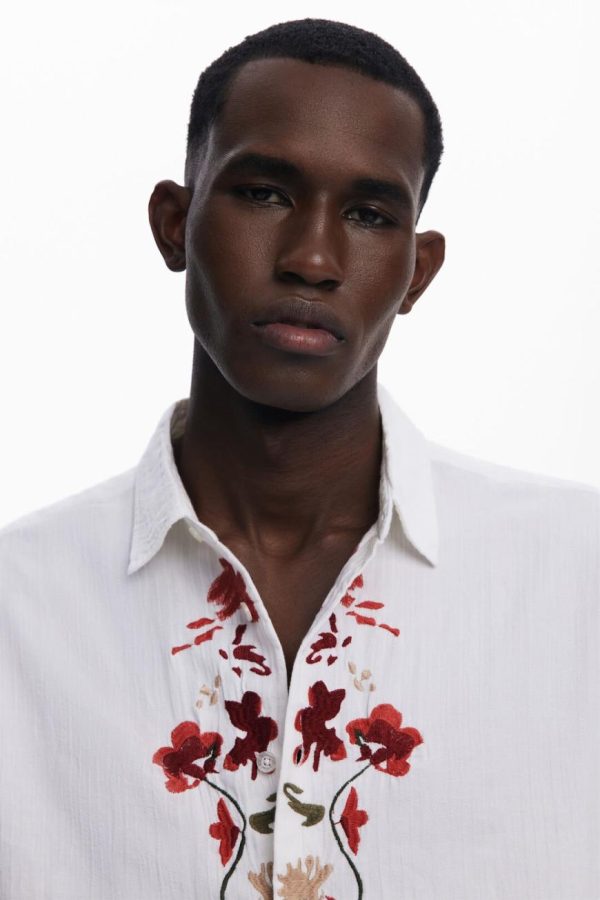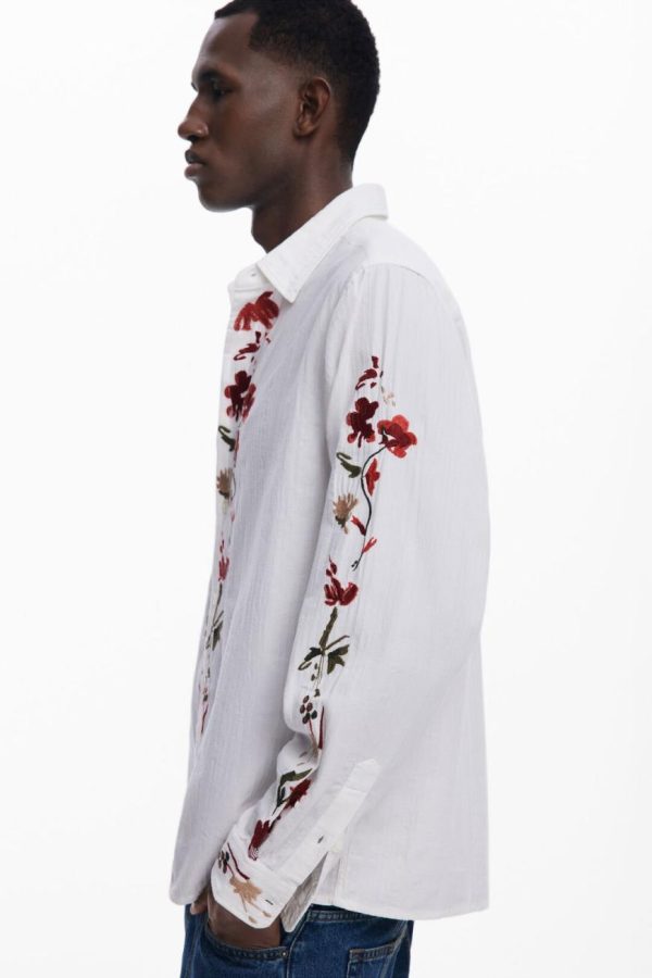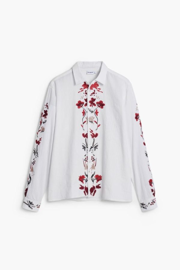 Long-sleeve shirt with decorative embroidery on the front, along the button line, and on the sleeves.