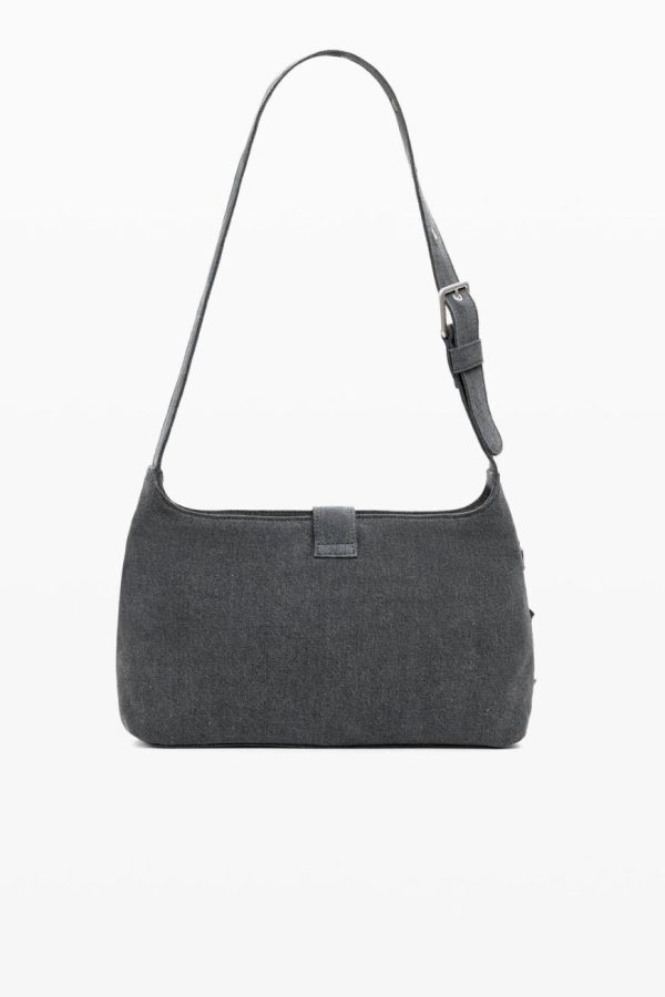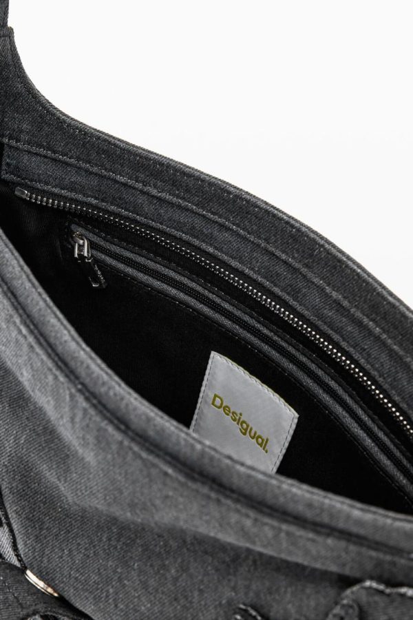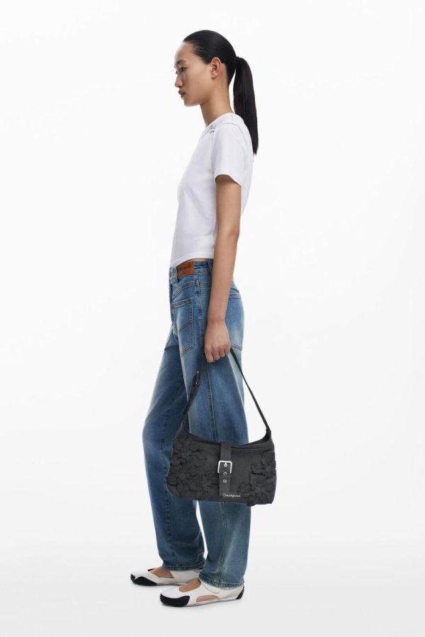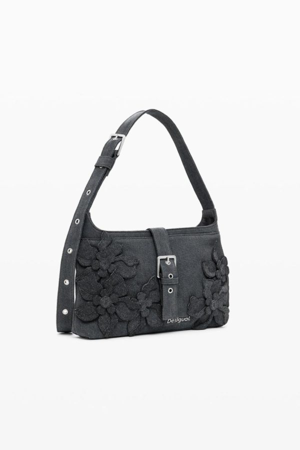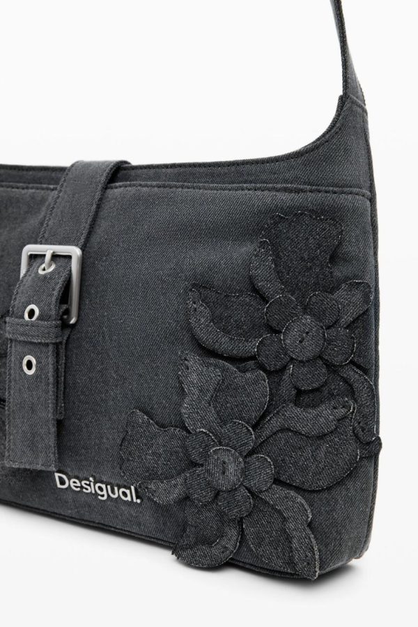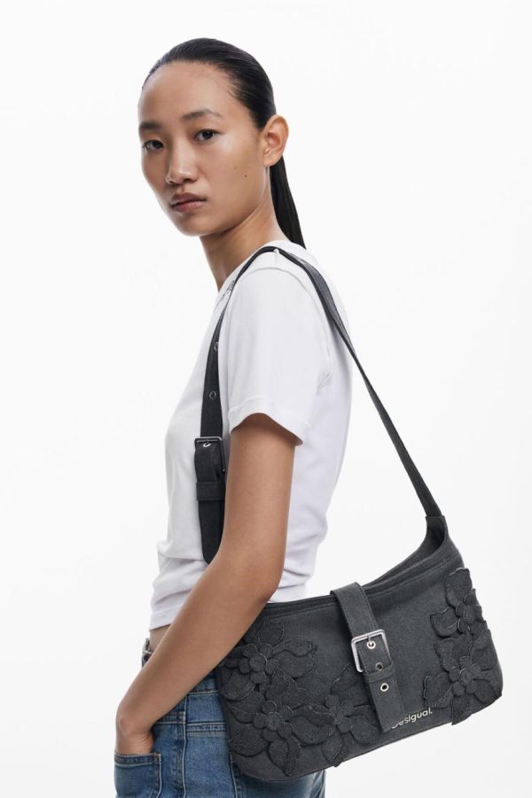 Medium bag with patchwork-style flower appliqués, metallic details, and decorative buckle.