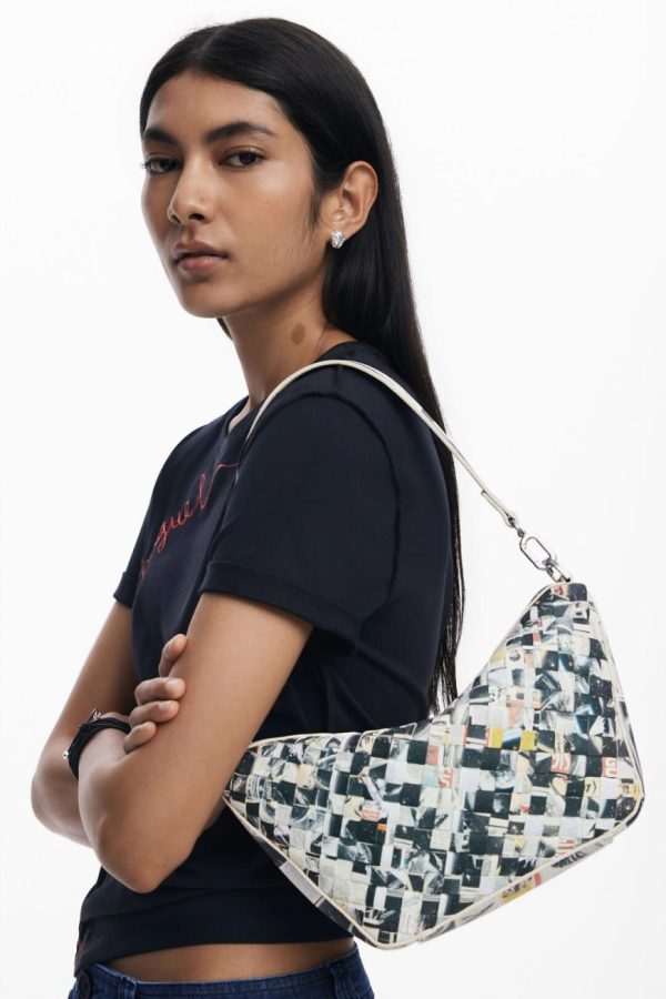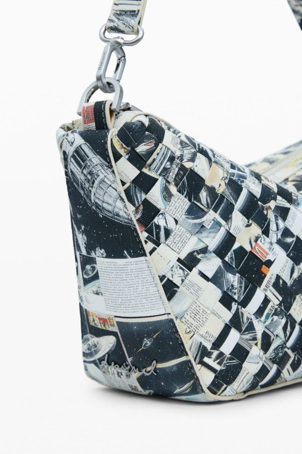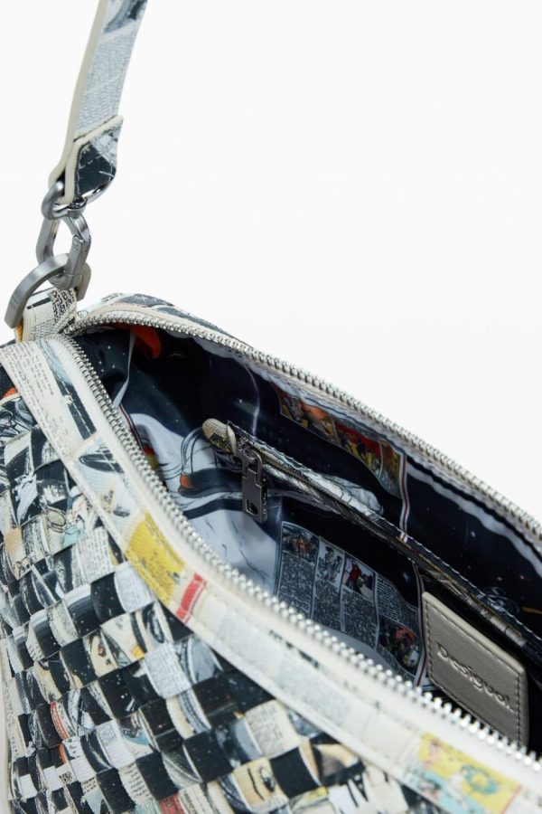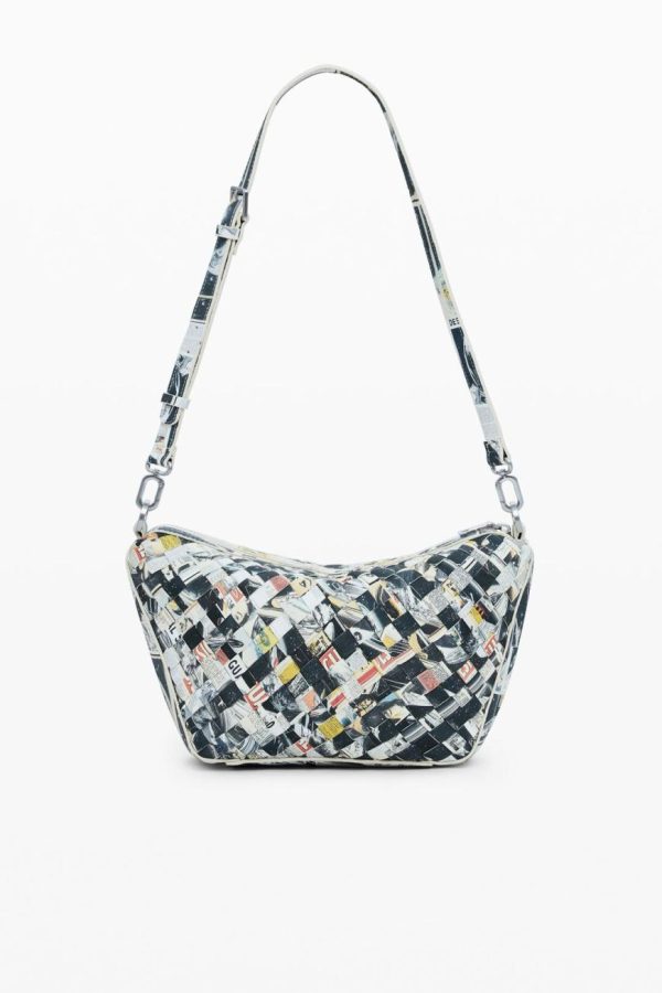 Crossbody-style bag made of braided leather-effect material, multiple compartments, and zipper closure.