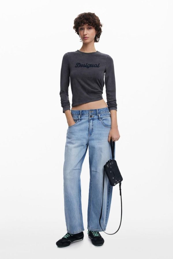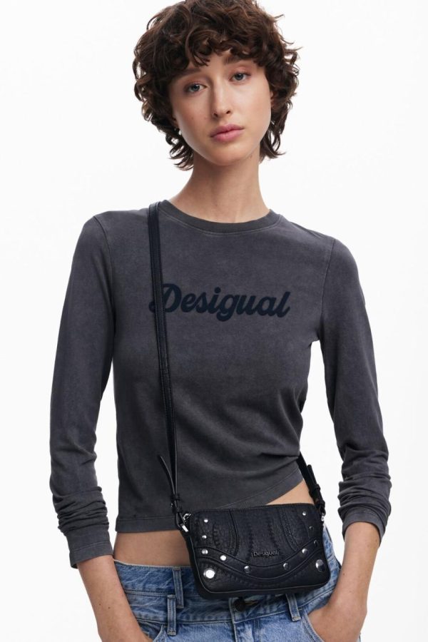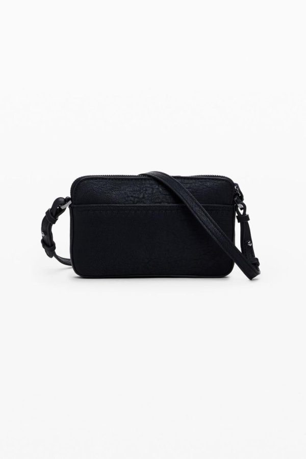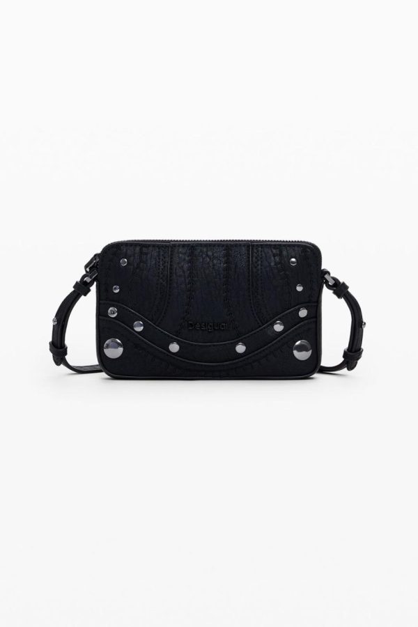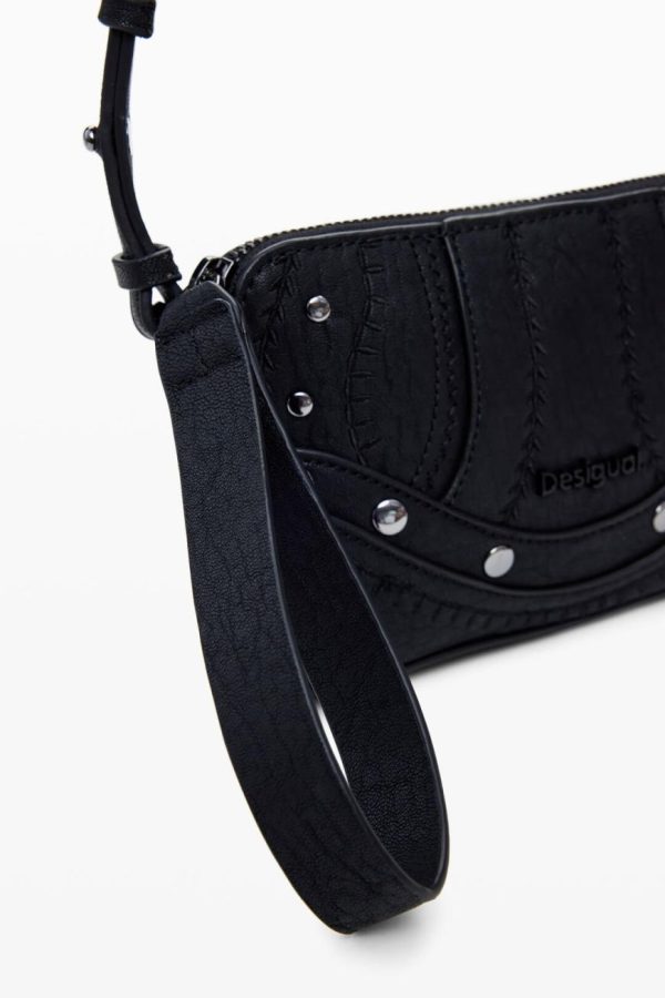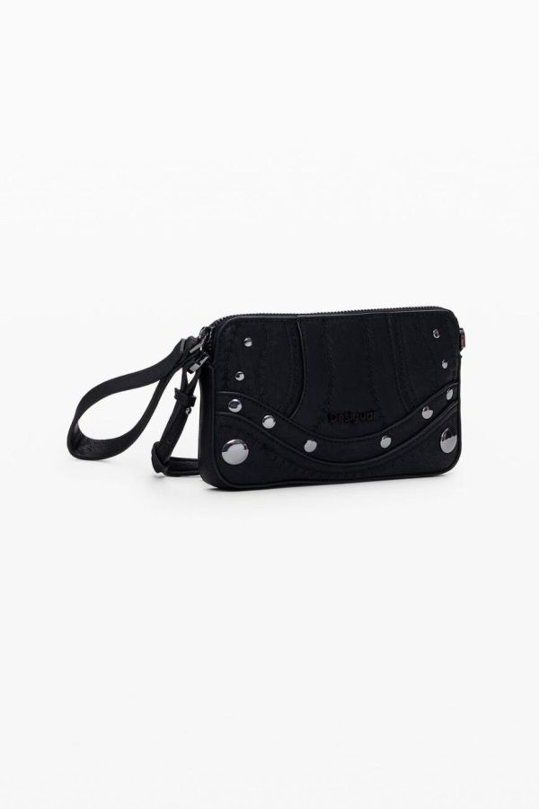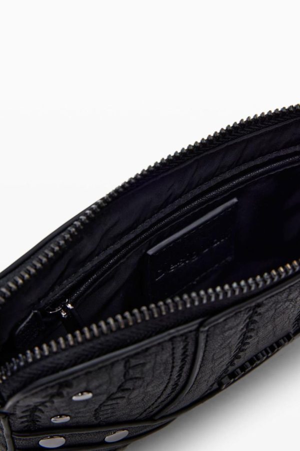 Large wallet with adjustable strap to wear as a crossbody, in textured leather effect with various geometric flower embroideries, multiple handles, and zipper closure