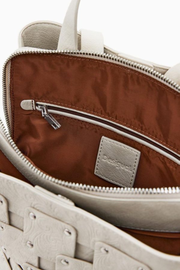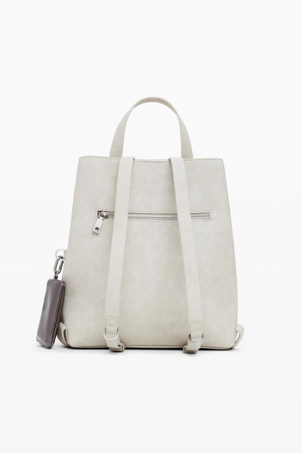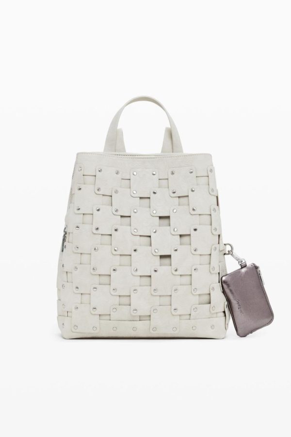 Medium faux leather backpack with engravings made up of multiple square patches, featuring metallic stud finish and detachable metallic faux leather coin purse keychain.