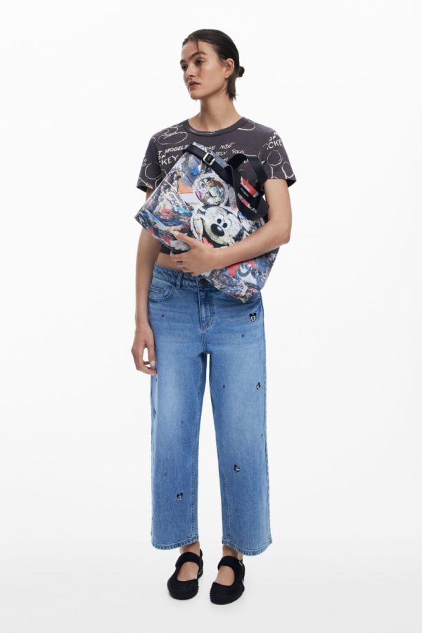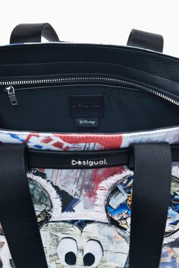Shoulder bag in briefcase style, made of fabric, with a fixed short handle and a detachable long strap, zipper closure, and graffiti-style print featuring Mickey Mouse™’s face.