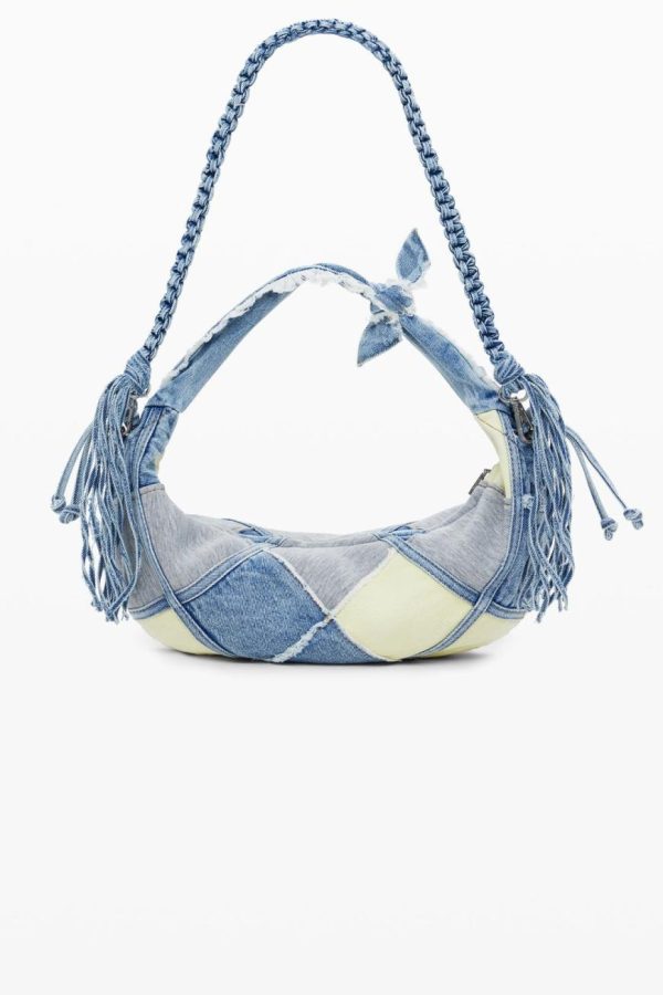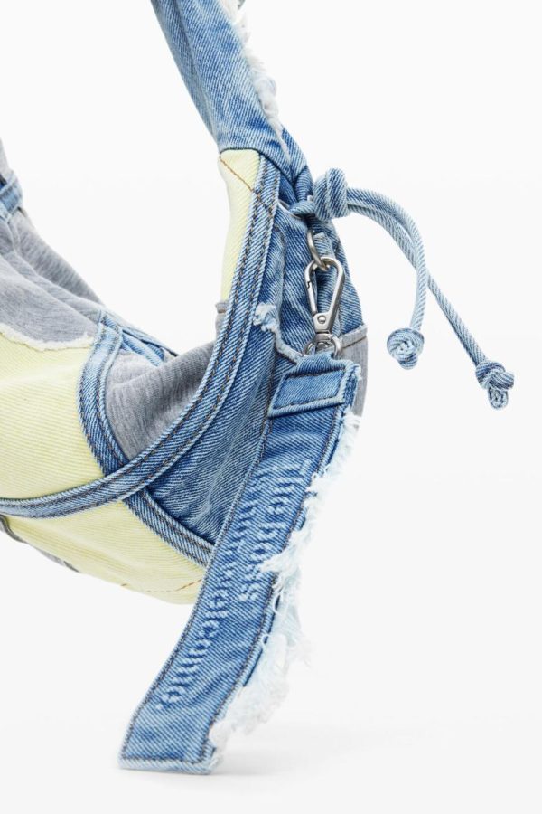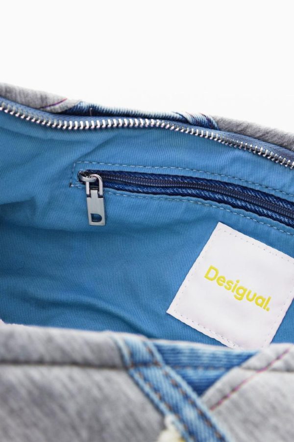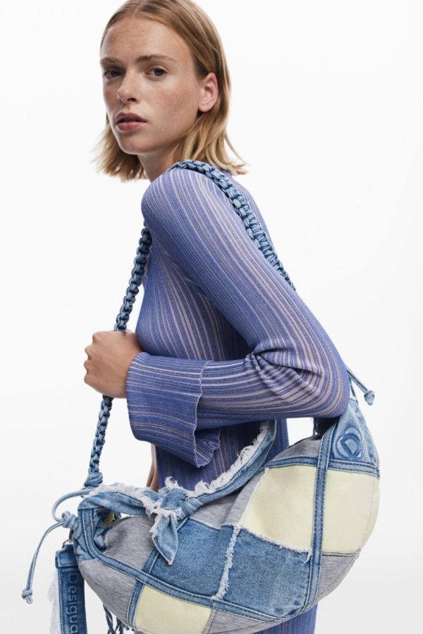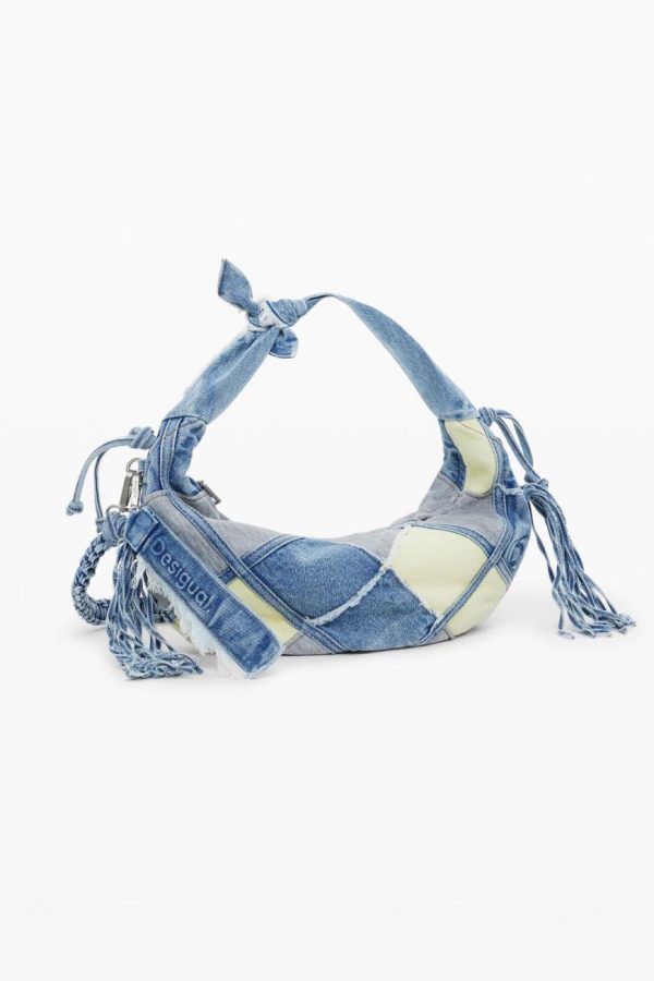 Patchwork-style handbag with a combination of fabrics, logo detail, and frayed seams.