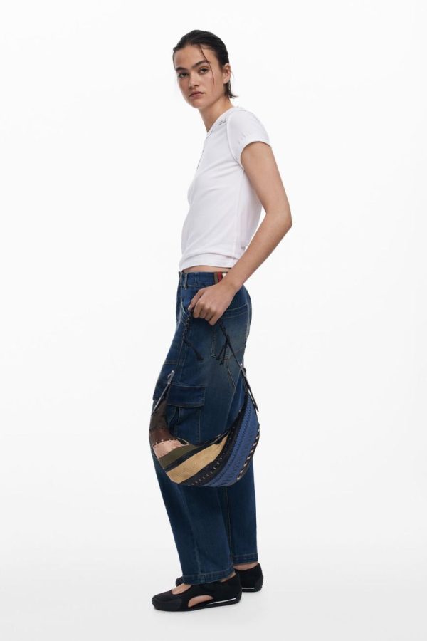 Discover this eye-catching medium-sized crossbody bag featuring an artistic patchwork design with leather-effect fabrics, versatile interchangeable handles, and secure zipper closure for everyday convenience.