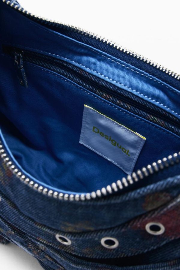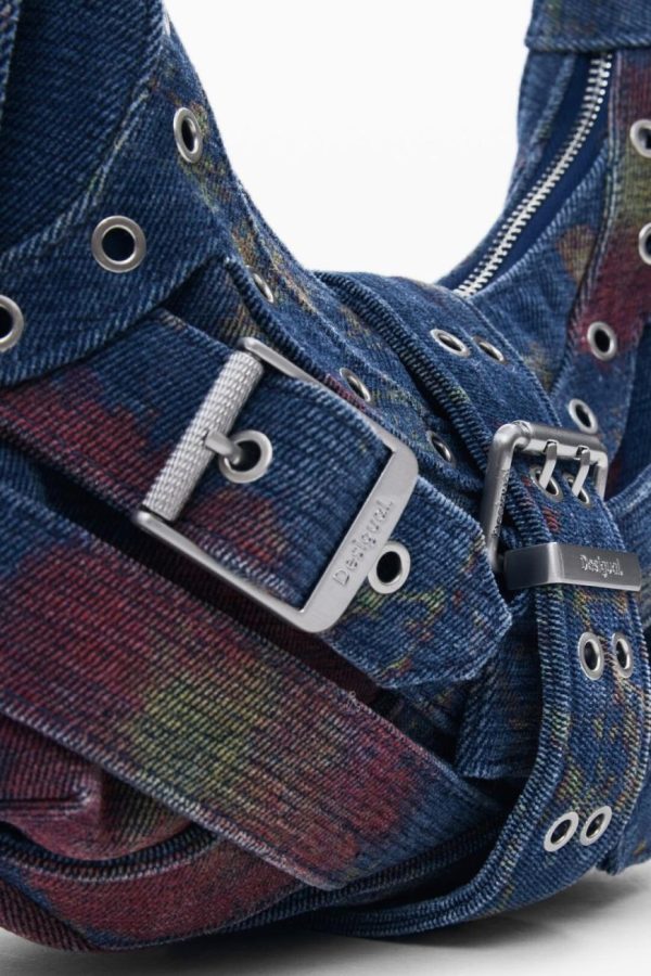 Stylish shoulder bag crafted from vibrant printed denim fabric, featuring chic buckle accents, an adjustable crossbody strap, and secure zipper closure for everyday convenience.