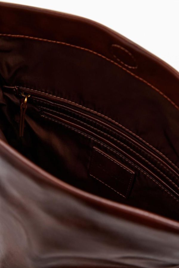 Medium bag in faux leather with a shiny finish, flap closure, zipper, and interchangeable handles with detachable keychain detail.