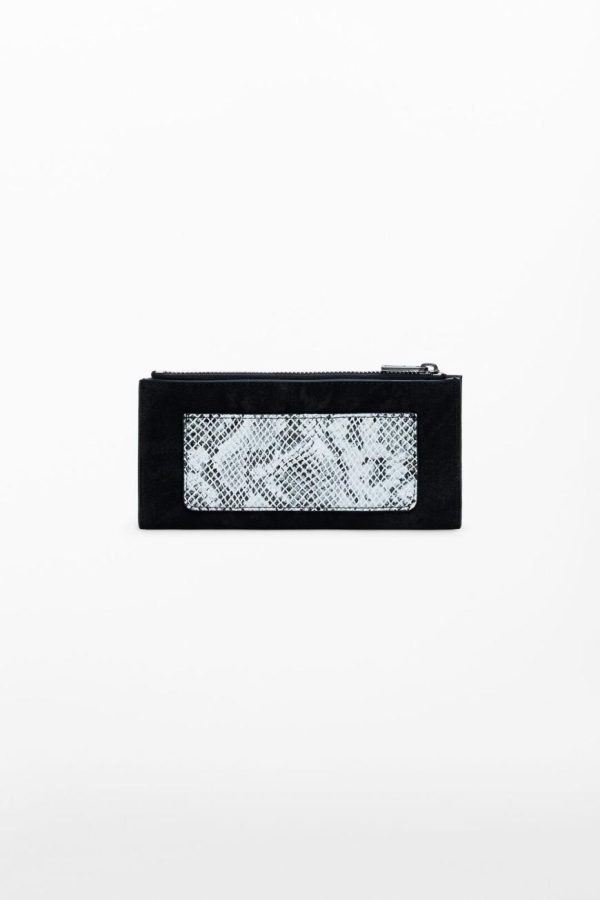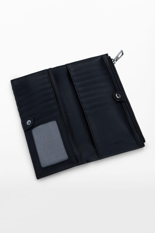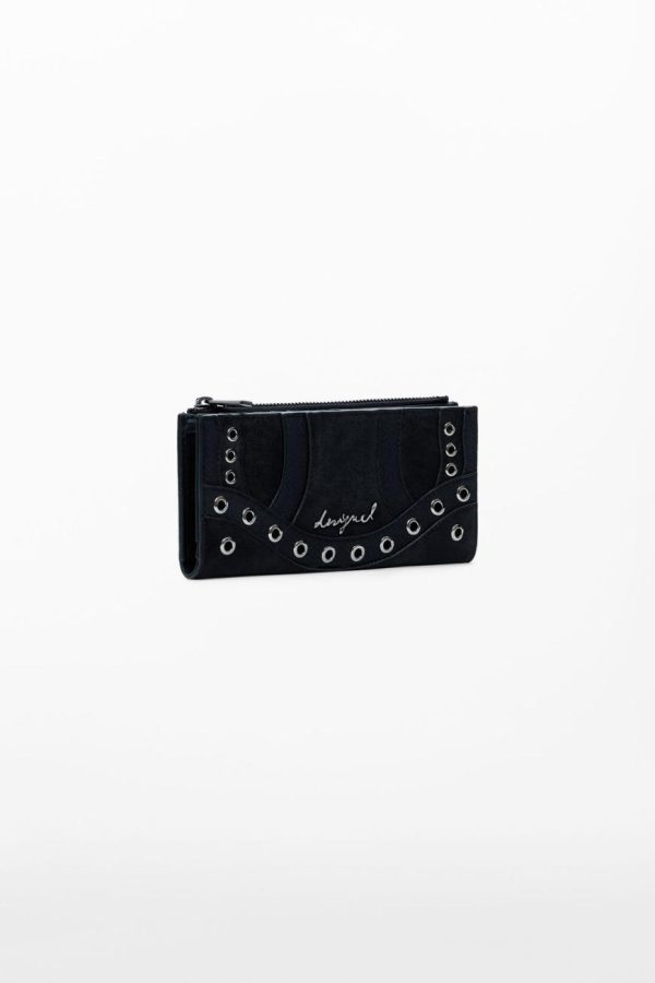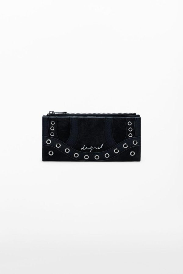 Medium wallet in faux leather fabric, with patchwork style combination, metal stud detail, and zipper and click button closure.
