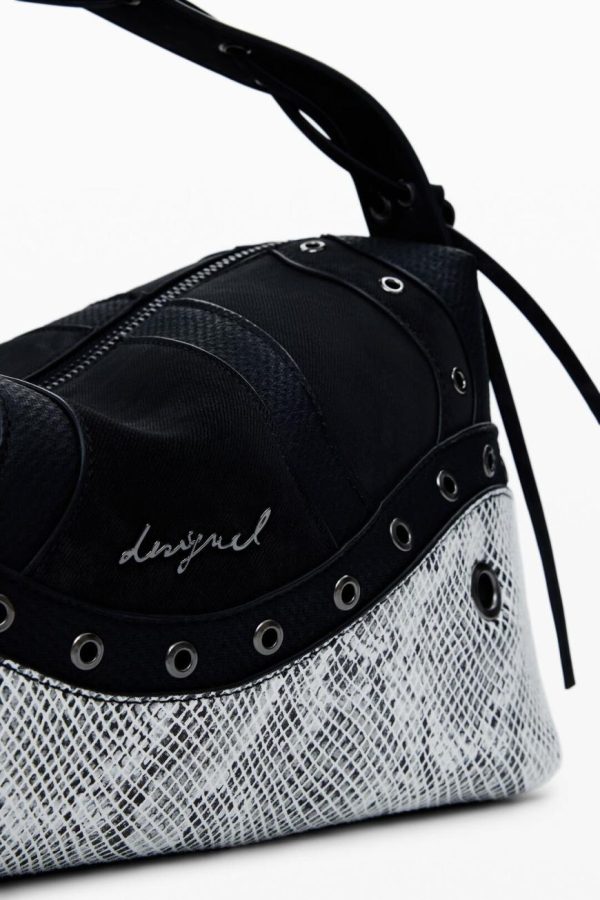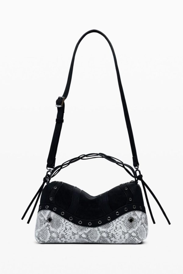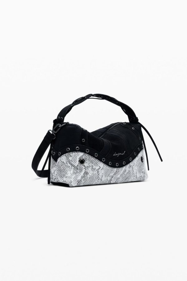 Elevate your style with this medium-sized statement handbag featuring an eye-catching snake-effect pattern, edgy metallic stud accents, versatile interchangeable handles, and secure zipper closure for everyday convenience.