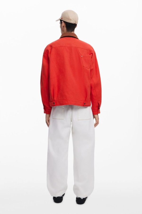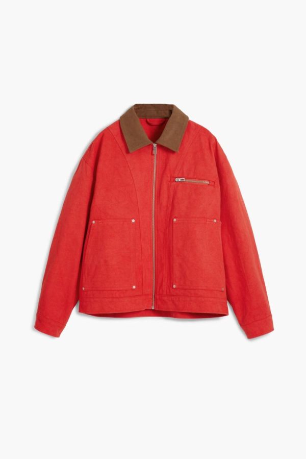 Make a bold statement with this eye-catching jacket featuring a dynamic contrast collar, convenient front zip pocket, and adjustable waist tabs for a customized fit.