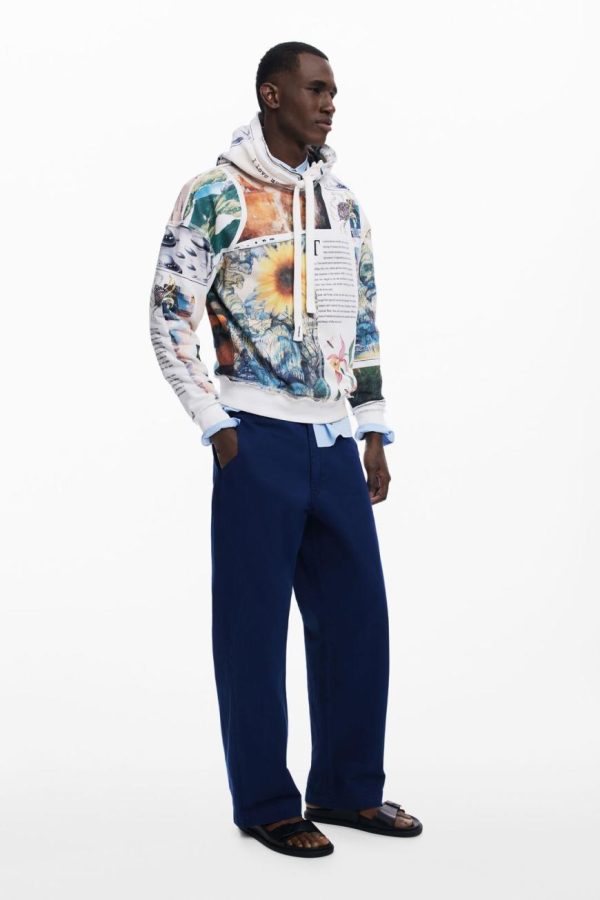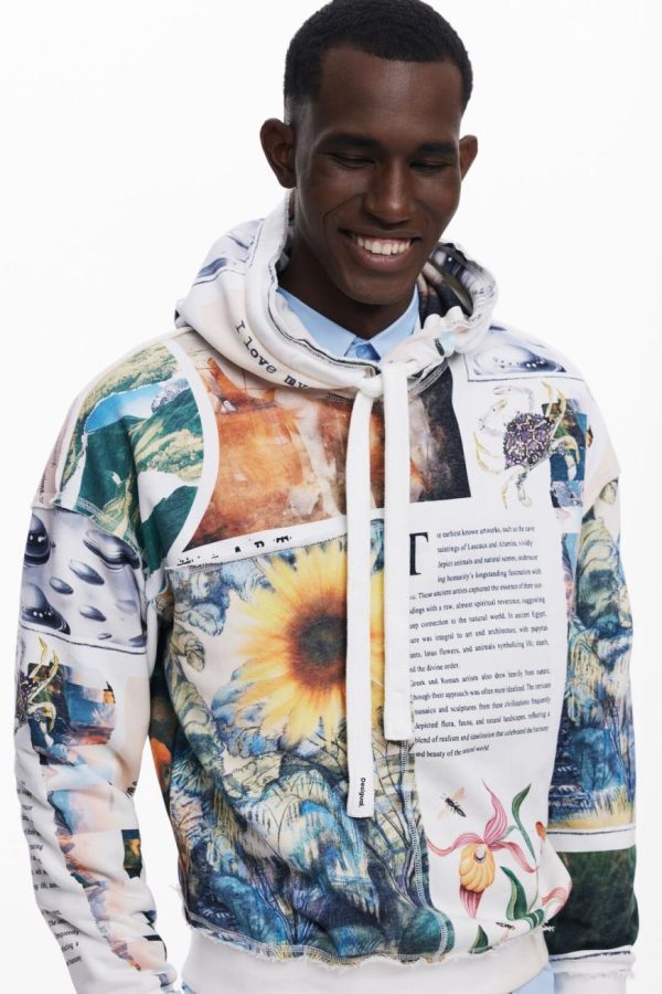 Stand out with this eye-catching long-sleeve hoodie featuring a vibrant sunflower print, contemporary news imagery, and distinctive decorative stitching for a truly unique streetwear statement.