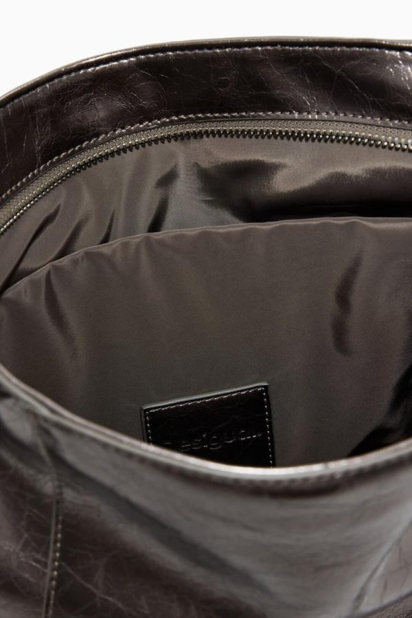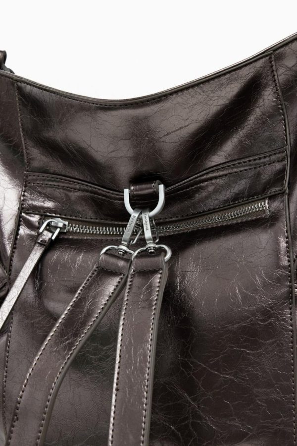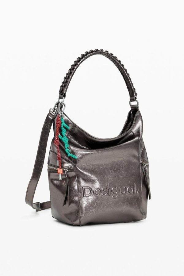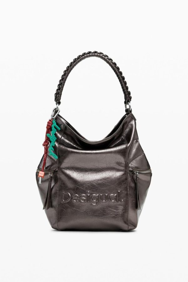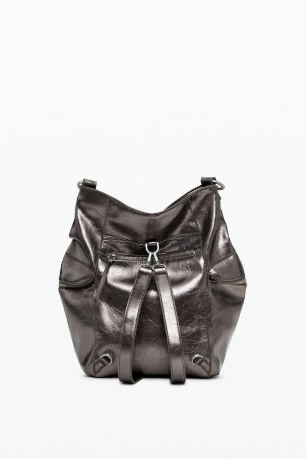 Large faux leather backpack with metallic finish, 3D effect logo, side pockets, detachable keychain, and removable braided handbag-style handle.