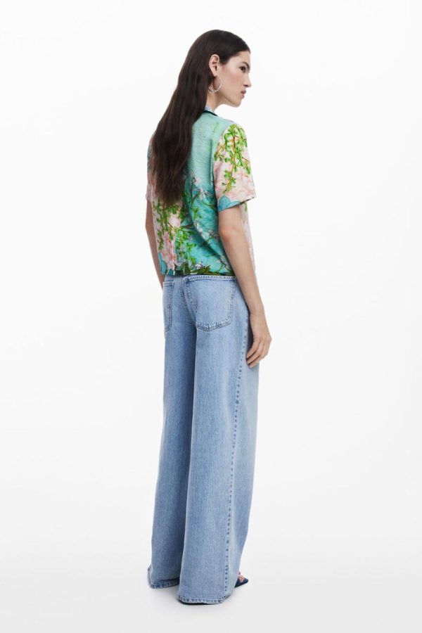 Short-sleeve shirt with button closure and mixed design with summer motifs.