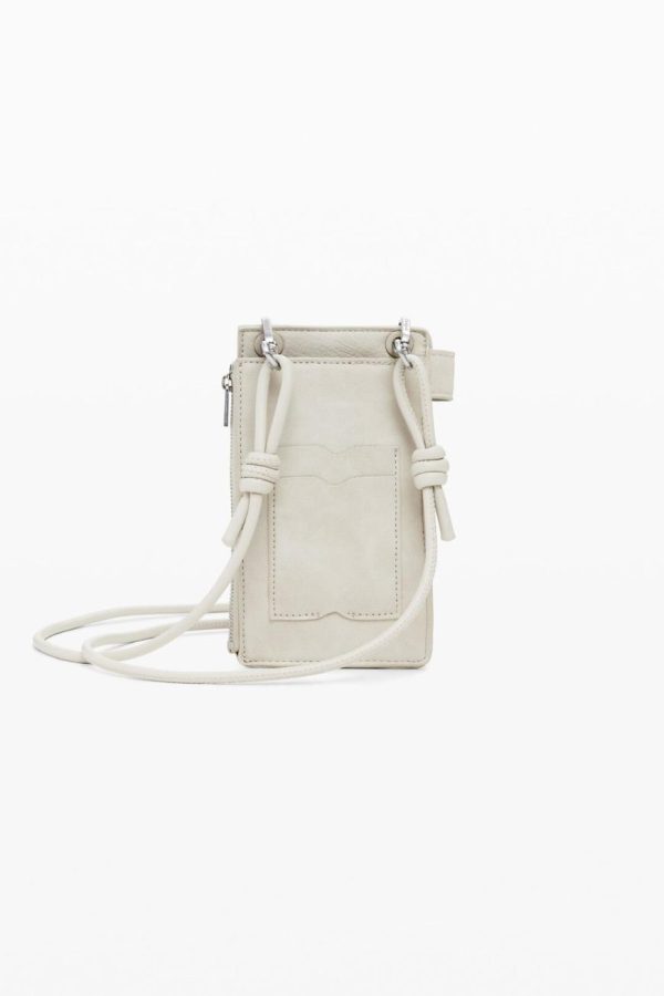 Mobile holder with zipper, different compartments, card slots, extendable strap, metallic logo, and decorative stitching.