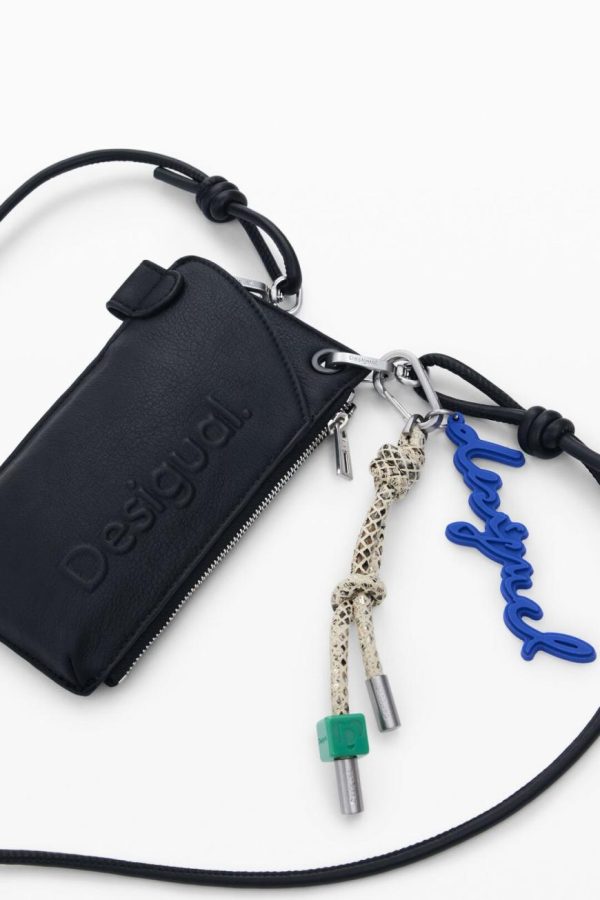 Mobile holder with zipper, different compartments, card slots, extendable strap, metallic logo, and decorative stitching.