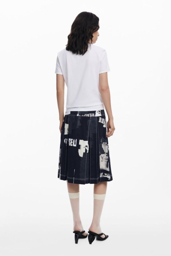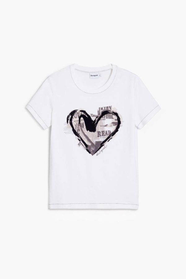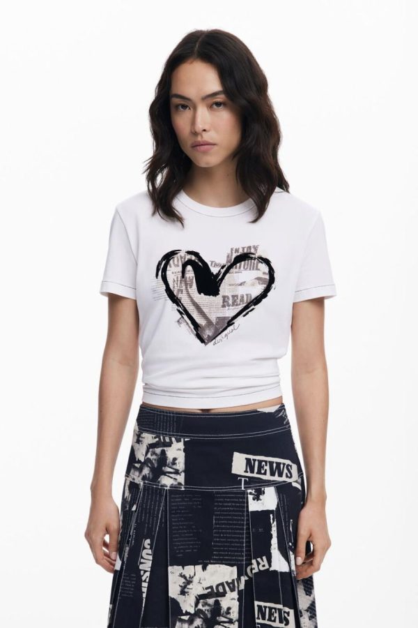 Short-sleeved T-shirt with a round neck and a velvet heart with a newspaper print inside.