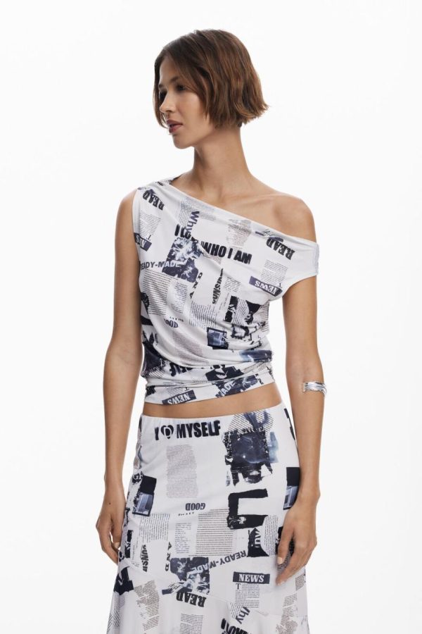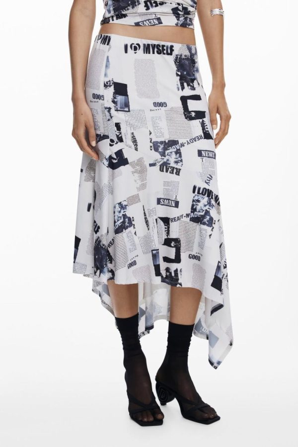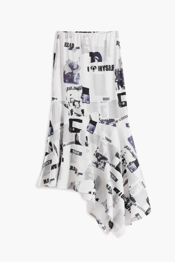 Discover this beautifully crafted knee-length skirt featuring a soft-touch feel, contemporary asymmetric hemline, comfortable elastic waistband, and eye-catching newspaper print design.