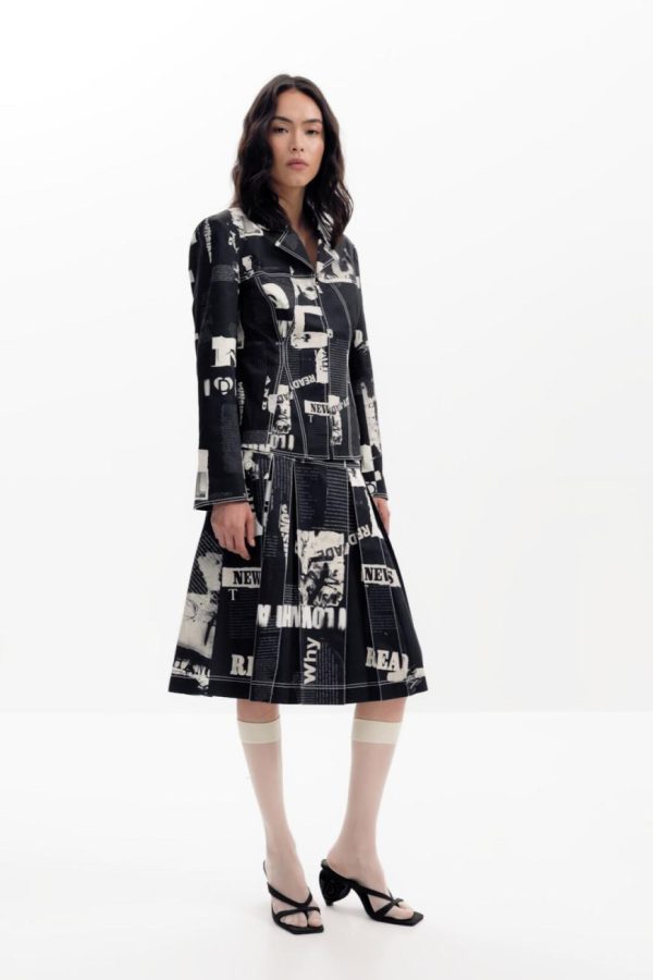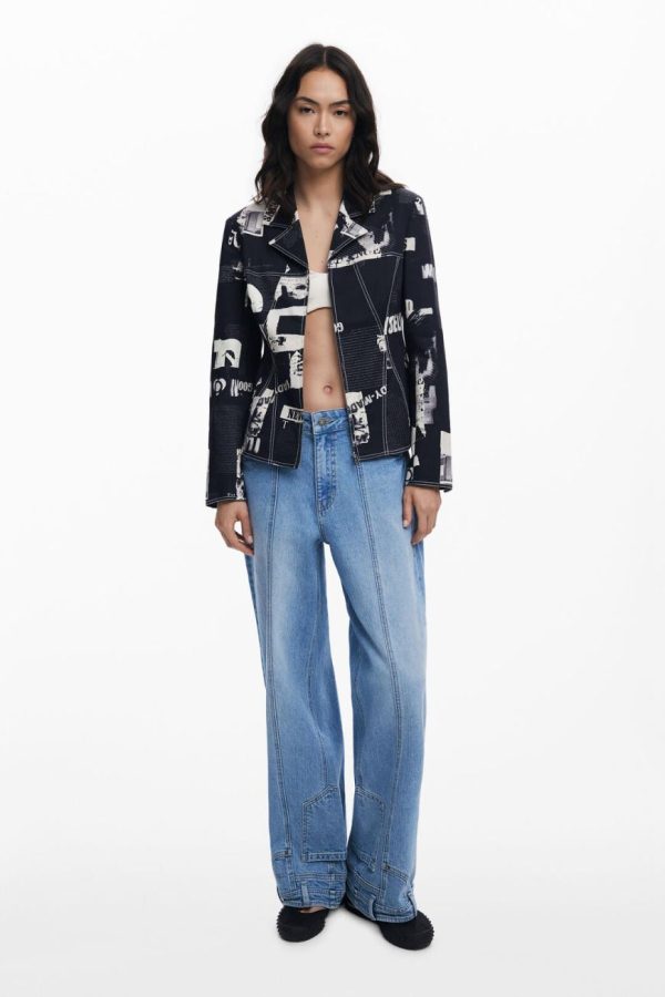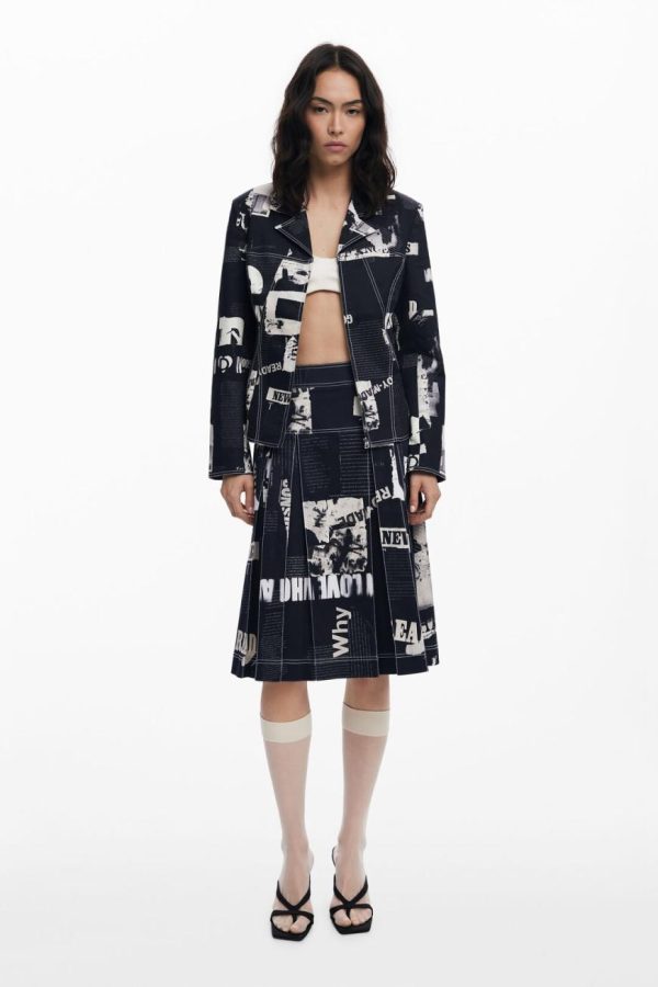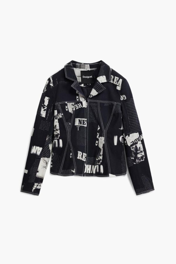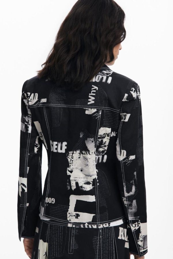 Fitted blazer with front seams, zipper closure, and newspaper print.