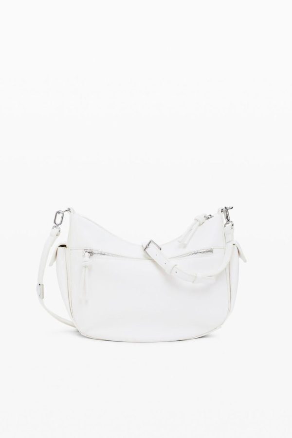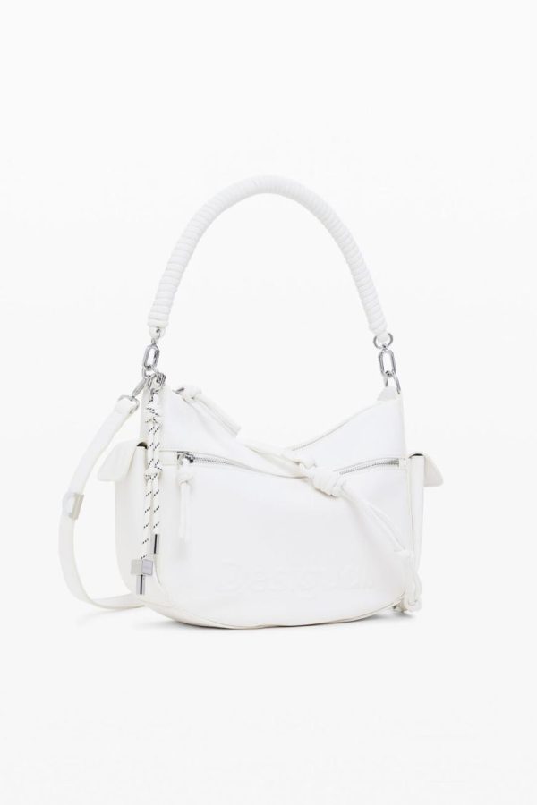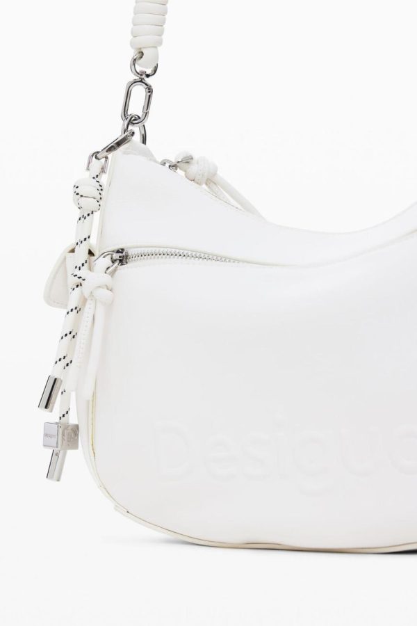 Oval-shaped shoulder bag in faux leather fabric, with multiple pockets, interchangeable handles, and solid color 3D effect logo.