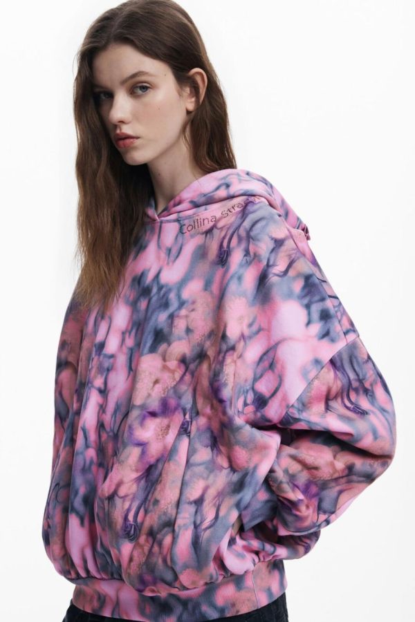 Oversized sweatshirt with ruffle detail on the hood, pockets, and strass detail designed by Collina Strada.