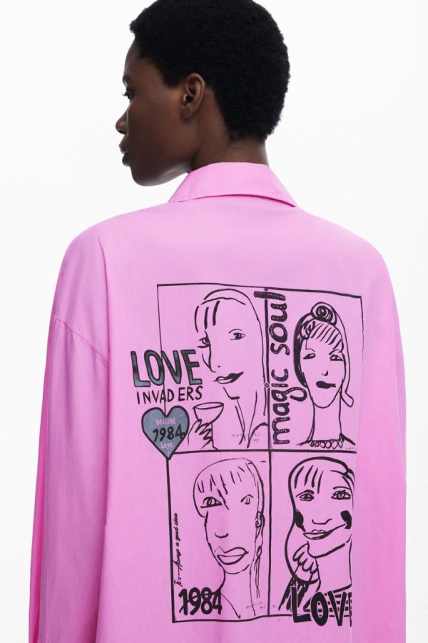 Oversized long-sleeve shirt with front pocket, in solid color and comic strip print with female silhouettes on the back.