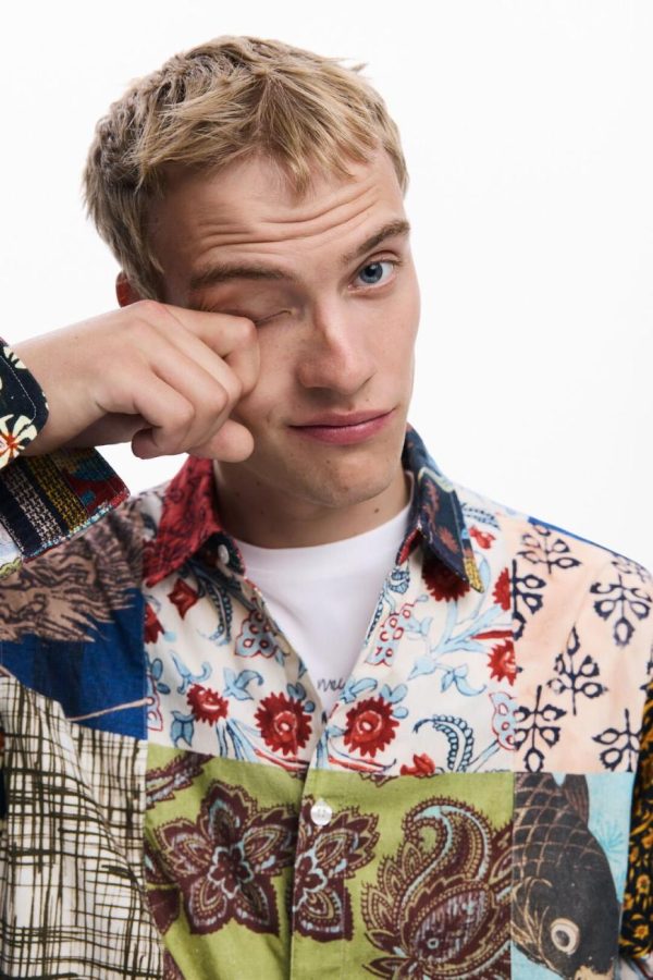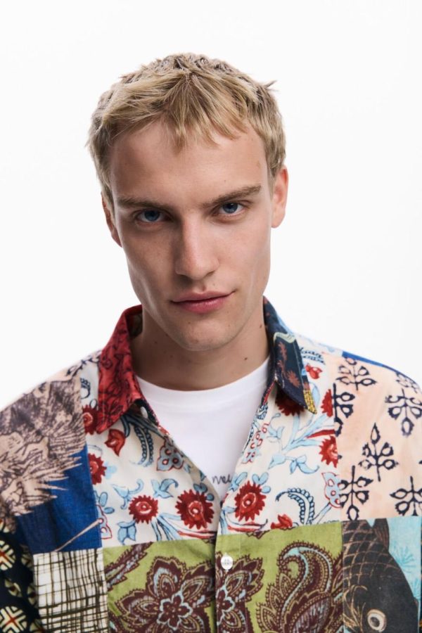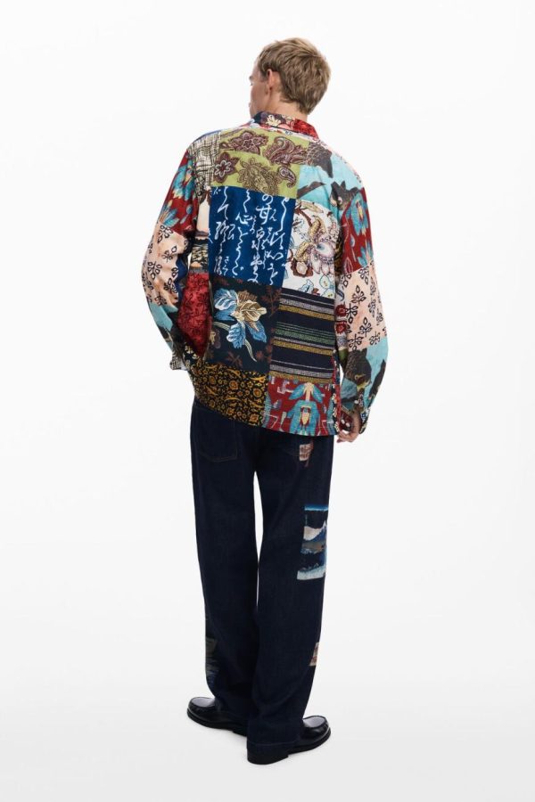 Long-sleeve regular-fit shirt made of cotton fabric with a patch design in various prints with a patchwork effect