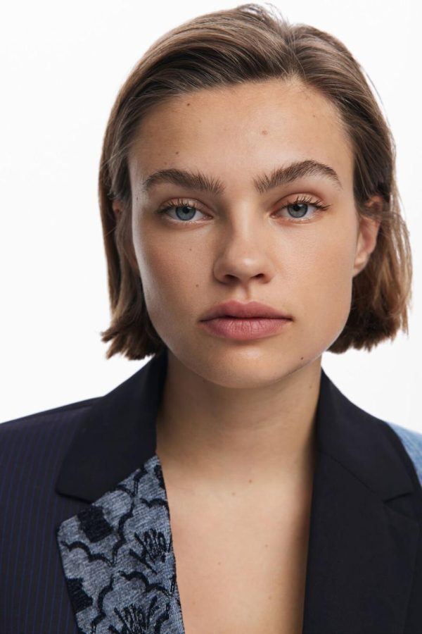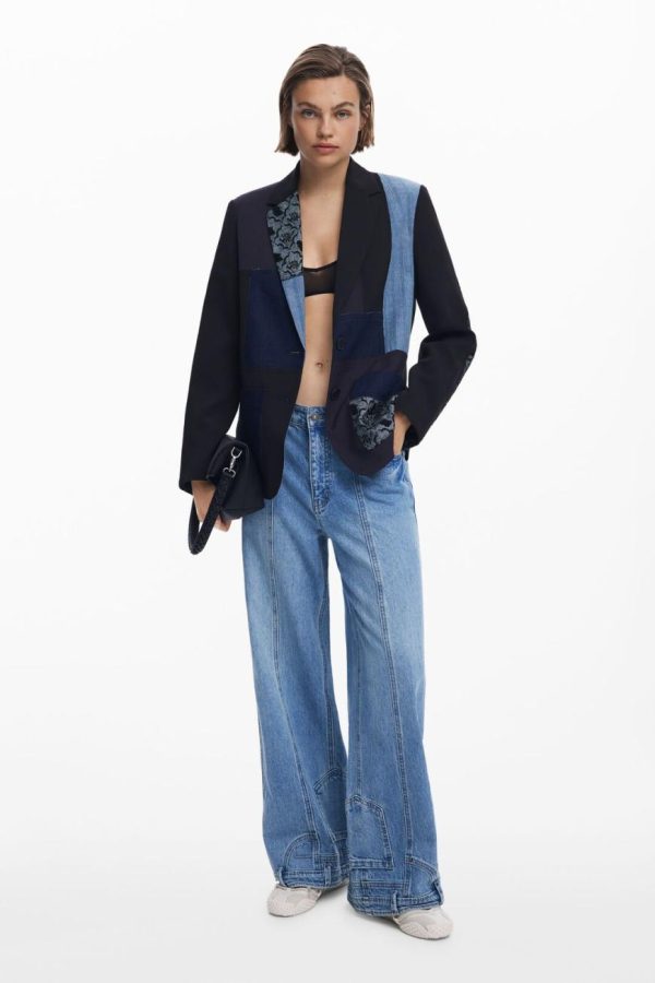 Regular fit blazer with front pockets, V-neck, and fabric combination using Patchwork technique.